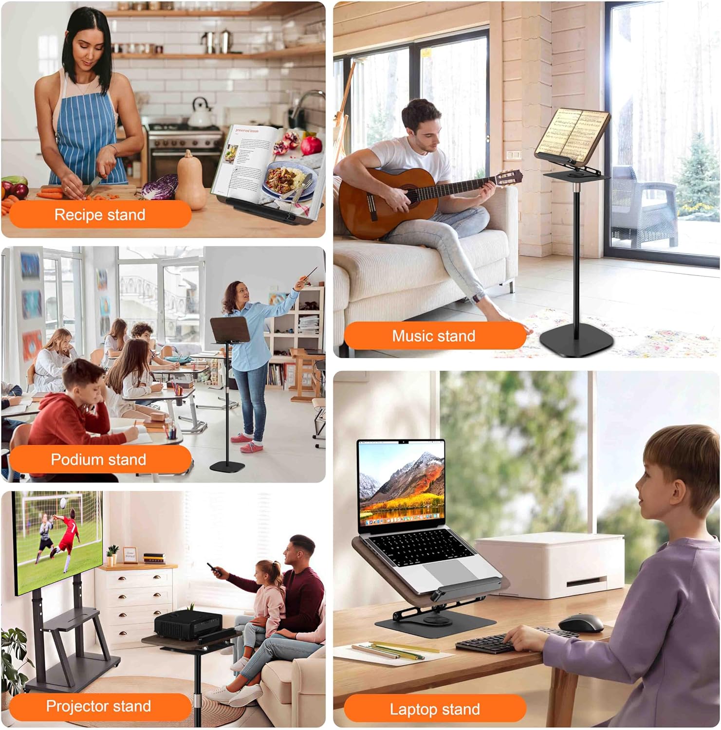 2-in-1 Design: Transform this book holder stand from a floor reading stand to a desktop book holder with just a few minutes. The detachable book stand for reading lets you switch between full-height floor use and convenient tabletop setup—perfect for home offices, kitchens, music rooms, or classrooms. No tools needed—reconfigure on the fly for any space or task. Adjustable Height & Angle: Enjoy 91–159cm (36"–62") height adjustment via sturdy telescopic carbon steel poles, so this book reading stand fits perfectly whether you're sitting, standing, or presenting. The 360° rotating panel and multi-angle tilt system let you customize the viewing position for optimal posture—reduce neck strain, eye fatigue, and back pain while reading, cooking, or working.