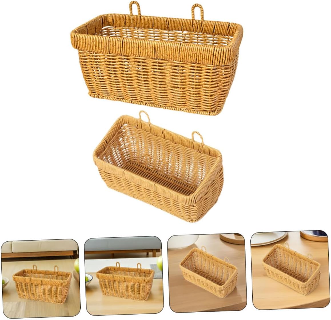 Package Include 1 x basket large 1 x basket small Characteristics -Product Info: Kitchen hanging basket -hanging wall vegetable basket: designed to make the most of wall space, these hanging baskets help declutter countertops and create a more organized kitchen imitation rattan storage basket -Color:Chocolate -Effortless cleaning: the smooth surface allows for quick and easy cleaning, maintaining a neat and sanitary storage area for your food items hanging woven wall basket -Size:28.00X16.00X13.00cm/11.00X6.29X5.11in - and : built with sturdy materials that resist wear and deformation, ensuring reliable performance for years to come -Size:21.50X12.50X8.00cm/8.45X4.91X3.14in -hanging storage basket: perfect for storing garlic, onions, ginger, eggs, and fruits, providing a versatile and efficient way to organize kitchen items wall woven hanging basket -Elegant faux rattan finish: the handwoven design adds a decorative touch to your kitchen while providing a practical storage solution kitchen wall basket -Material:PlasticGoods Descriptionkitchen fruit hanging basket Designed to meet the needs of modern kitchens, these hanging baskets offer a convenient way to keep frequently used items within reach.multi-purpose basket Their hand-woven texture and imitation rattan material add a touch of elegance, while their versatile design they can be used for storage, decoration, or both, enhancing your kitchen's functionality