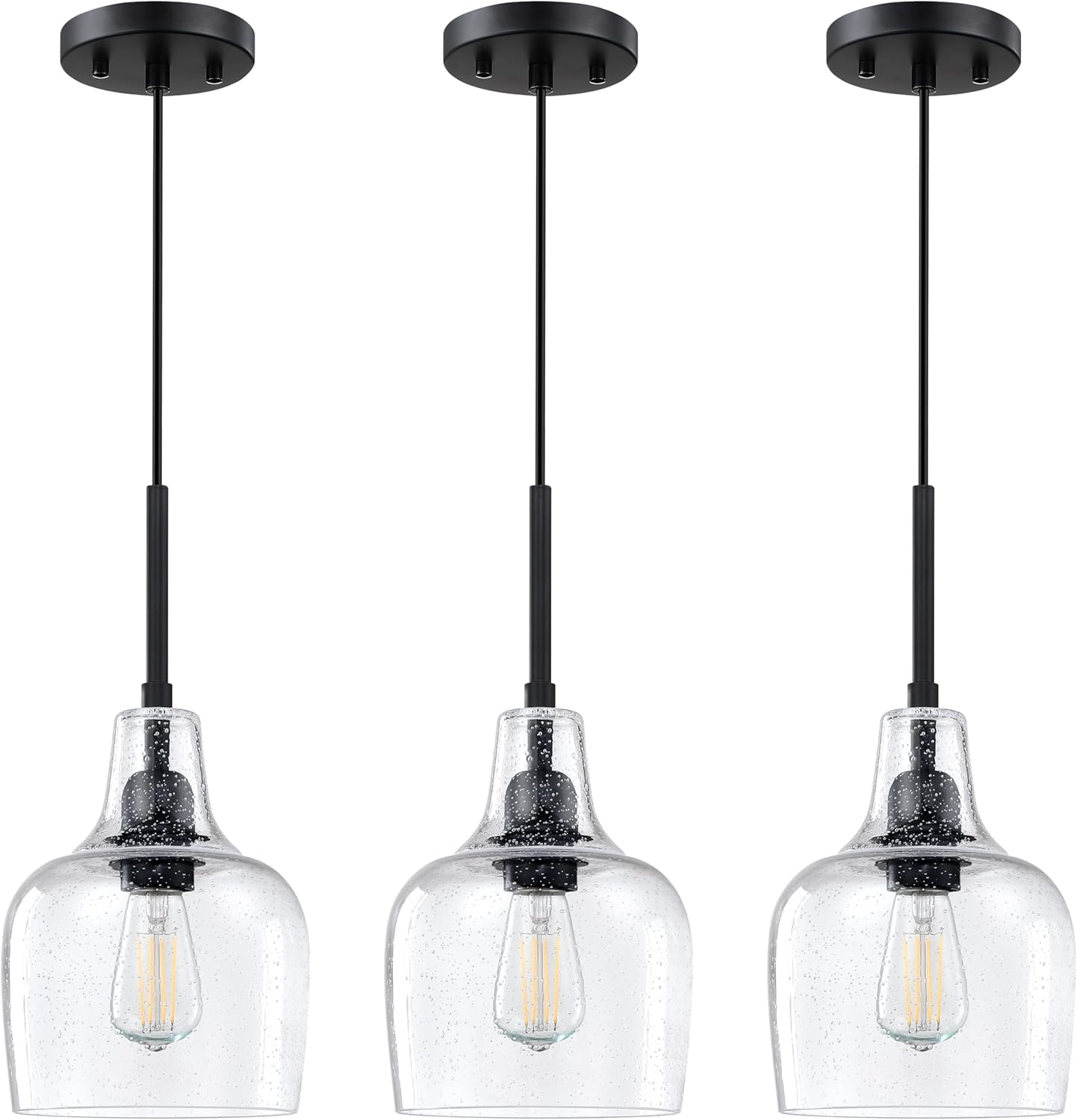 Enhance the aesthetic appeal of your home with the Dolaimy House 1 Light Indoor Kitchen Island Pendant Light. Designed with a modern farmhouse style and a sleek black finish, this dining room hanging light fixture is the perfect addition to any space. Crafted from high-quality glass, the ceiling light cover for kitchen over sink not only provides ample illumination but also adds a touch of elegance to your surroundings. The premium glass construction ensures durability and longevity, making it a wise investment for your home. Perfect for hanging in the kitchen, dining area, or over the sink, this seeded glass pendant light creates a warm and inviting atmosphere. The adjustable cord allows you to customize the hanging height, ensuring it fits perfectly within your space. Choose from multiple options, including a 2 pack or 3 pack, to suit your specific needs. Additionally, you can select from clear glass hanging light fixture, small lighting shade in amber glass, ancient blue glass, or ancient green glass pendant lights, depending on your personal style and decor preferences. Illuminate your home in style with the Dolaimy House 1 Light Kitchen Pendant Light for Island. Whether you're hosting a dinner party or simply enjoying a quiet meal with your family, this glass pendant light will add a touch of sophistication and charm to any occasion. Don't miss out on the opportunity to create a beautifully lit and inviting space with this modern farmhouse pendant light.