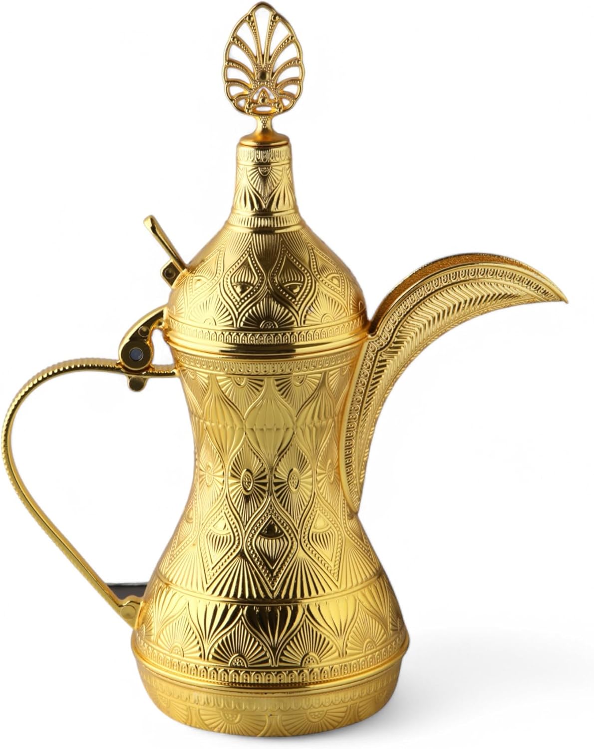 Bring the charm of the Middle East into your home with the Alisveristime Decorative Zamac Dallah Pitcher. Designed for decorative purposes only, this intricately engraved piece is inspired by traditional Ottoman and Arabian coffee culture. Made entirely from durable zamac, it showcases a stunning curved spout, an ornate handle, and a removable lid for an authentic touch. Available in gold and silver colors, this unique decorative item is perfect for adding a sophisticated accent to your coffee table, kitchen, or display shelf. Measuring 9.84” (H) x 7.87” (W) x 3.94” (D) and weighing 1.72 lbs (780g), it is both lightweight and sturdy, making it an eye-catching conversation piece.