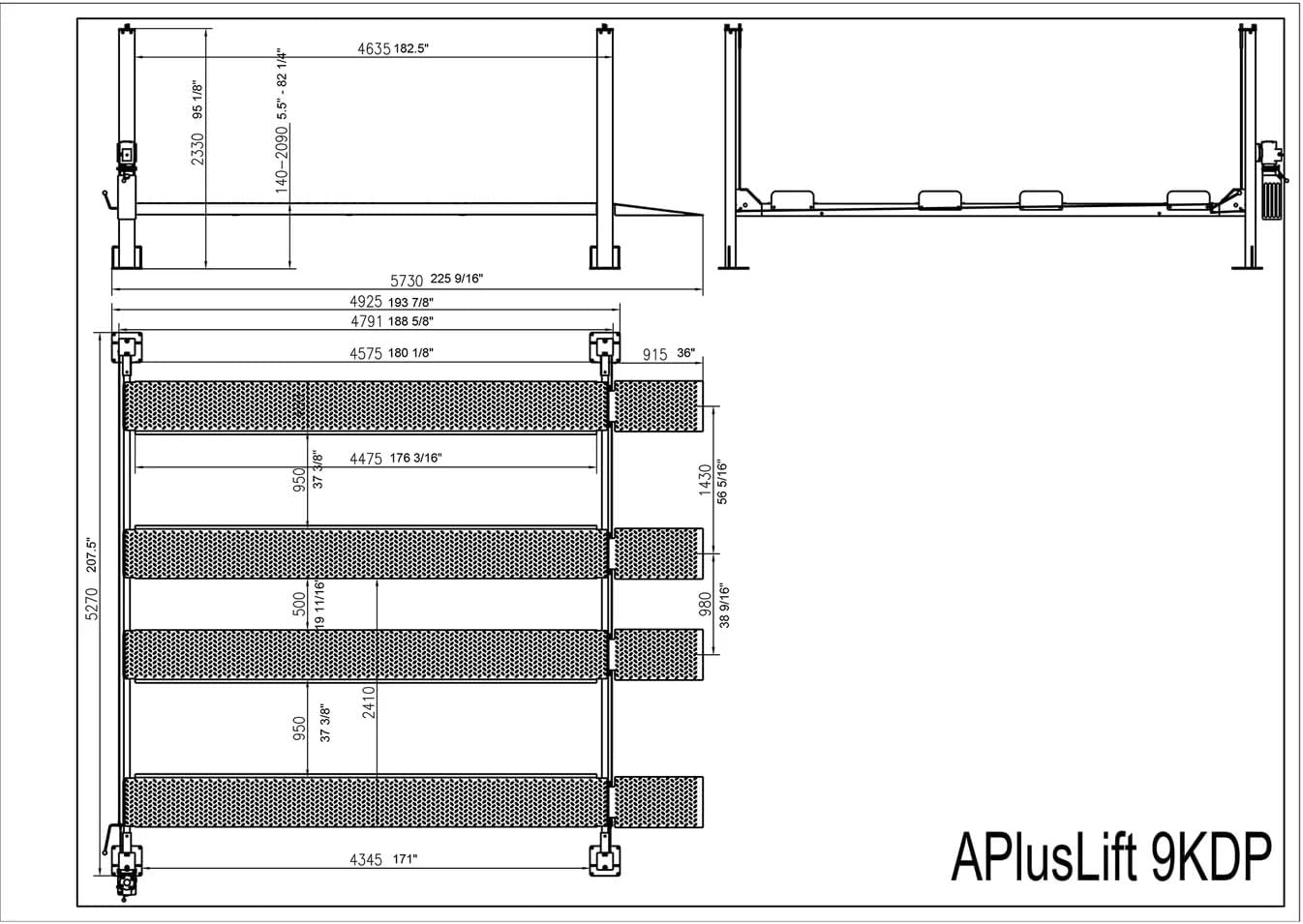 | Included Components | APlusLift HW-9KDP 4-Post Lift includes 2 decks, 4 runways, a caster kit, 2 jack trays, 6 drip trays, 4 removable approach ramps, and a power cord. |
