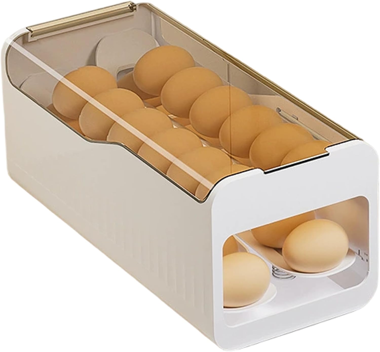 • Gentle Press-to-Release Rolling System: This egg dispenser features a smart spring-assisted mechanism. With a light press, eggs roll forward gently and securely to the front for easy removal, minimizing handling and potential cracks.