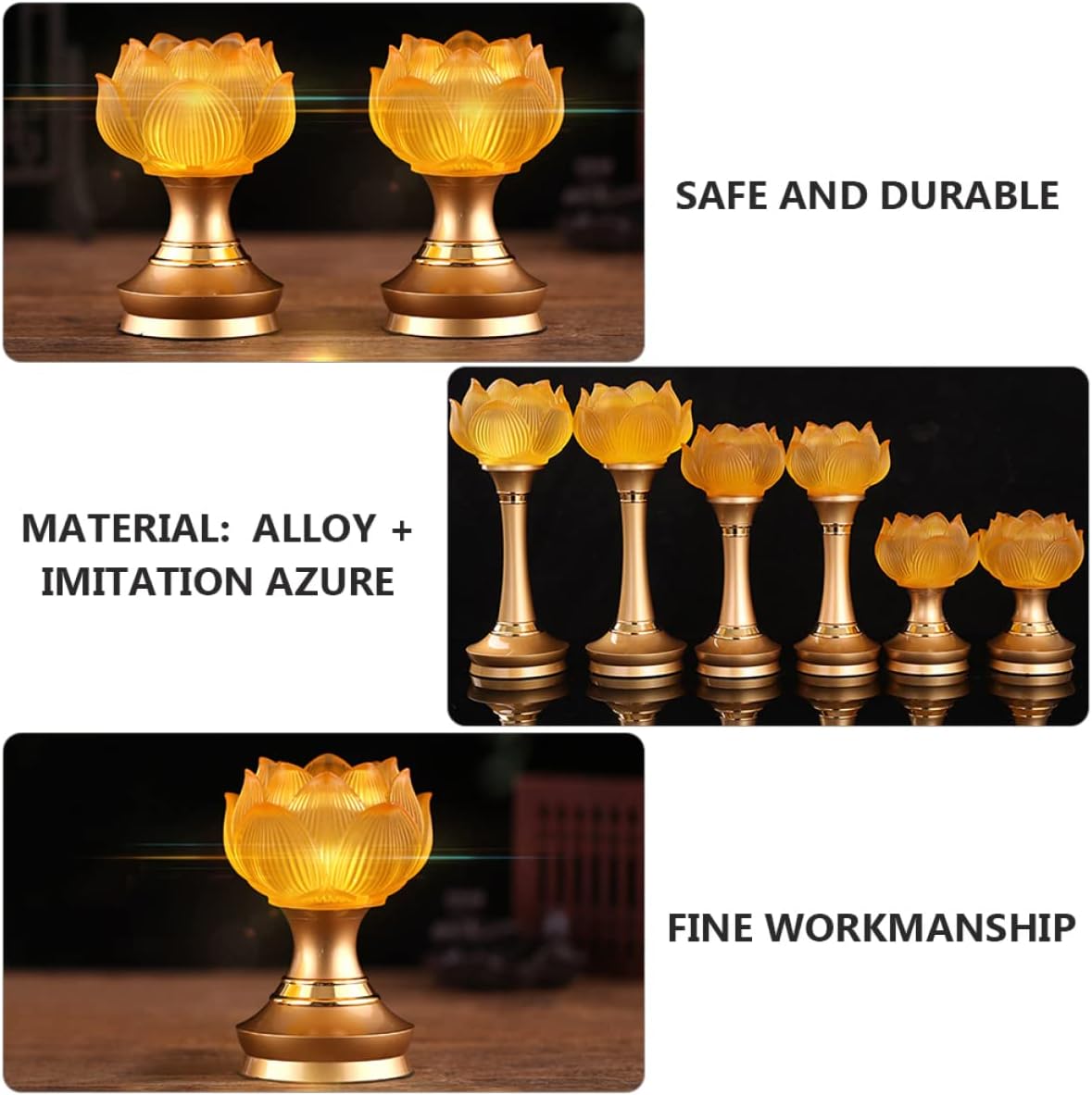 Package Include 2 x lotus lamps Characteristics - Battery: 3AA batteries (not included) Lotus Lamp Decor. - Size: 13.00X7.50X7.50cm/5.11X2.95X2.95in LED Lotus Lamp - Color: As Shown Buddha Lamp. - Material: Alloy, Imitation Azure Stone Home Decoration. - Featuring lotus flower shaped design, and , it is a lamp Lotus Shaped Lamp. - Made of material, and for use Buddha Hall Lamp. - The Buddha lamp is lightweight and small in size, easy to carry, very convenient Light Ornament. - The lotus lamp is placed on the Buddha's table, which can be used by the Buddha worship Desktop Light. - It can be used as a Buddha hall lamp, home decoration, temple decoration, etc Lotus Shape Lamp.Goods DescriptionBuddha Hall Lamp Creative lotus shape design with fine workmanship makes it suitable for most occasions.Light Ornament The lotus lamp is placed on the Buddha's table, which can be used by the Buddha worship.Lotus Shape Ornament This item is a lotus lamp, made of alloy material, for a long term use
