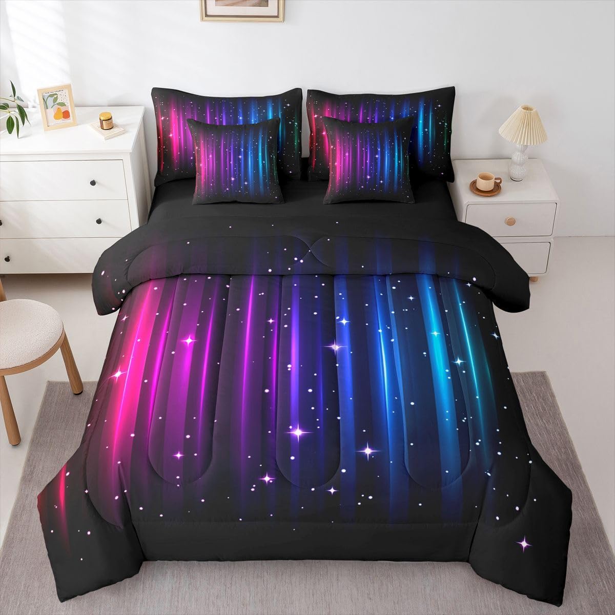 Colorful Makeover to Your Life Various size and color options, there are always decor room. Size Options: 7 Pieces Twin Size,1 Comforter 68"x 90", 1 Fitted Sheet 39"x75"x16", 1 Flat Sheet 96"x66", 2 Pillow Cases 30" x 20",2 Throw Pillow Covers,Covers Only. 18"x 18". 7 Pieces Full Size ,1 Comforter 79"x 90", 1 Fitted Sheet 54"x75"x16", 1 Flat Sheet 96"x81", 2 Pillow Cases 30" x 20",2 Throw Pillow Covers,Covers Only. 18"x 18". 7 Pieces Queen Size,1 Comforter 90"x 90", 1 Fitted Sheet 60"x80"x16", 1 Flat Sheet 102"x90", 2 Pillow Cases 30" x 20",2 Throw Pillow Covers,Covers Only. 18"x 18". 7 Pieces King Size,1 Comforter 104"x 90", 1 Fitted Sheet 78"x80"x16", 1 Flat Sheet 106"x90", 2 Pillow Cases 30" x 20",2 Throw Pillow Covers,Covers Only. 18"x 18". Decoration: For your mom, dad, sister, brother, grandma, wife, husband, and all other beloved with many surprising designs. You can find a design for everybody and every interest in our collection. Your Home,You Decide Different types of bedding sets could bring rooms in different styles. Also, rooms in different styles needs different types of bedding sets