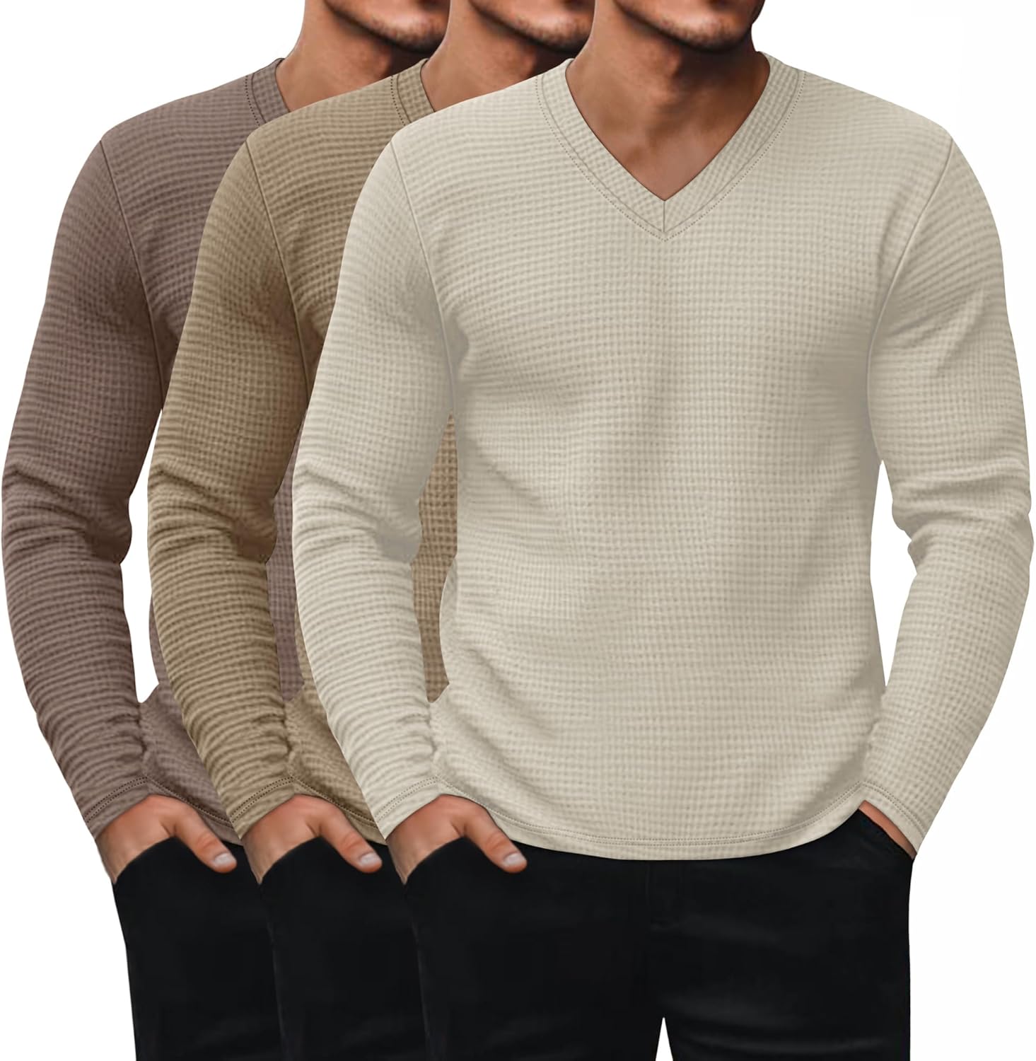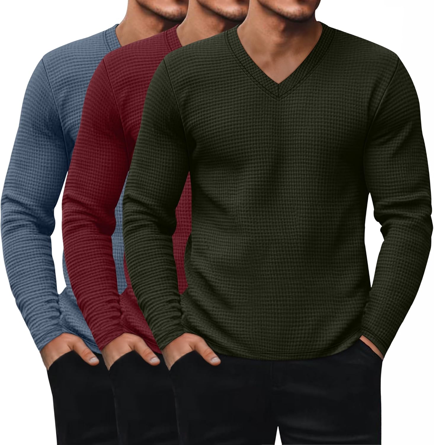 Features: Details: The waffle long sleeve shirts for men, beefy long sleeves, v neck, waffle knitted fabric, solid color, classic, and durable fall long sleeve shirts. Easy care: Machine and hand wash safe. Recommend to wash in cold water and tumble dry low or line dry. Specifications: Material: 65% Polyester, 30% Cotton, 5% Spandex Package includes: 3 x Men's waffle long sleeve shirts Notes: Manual measurement, please allow slight errors on size. The color may exist a slight difference due to different screen displays. Please do not wash our products with other clothes, and bleaching is not allowed