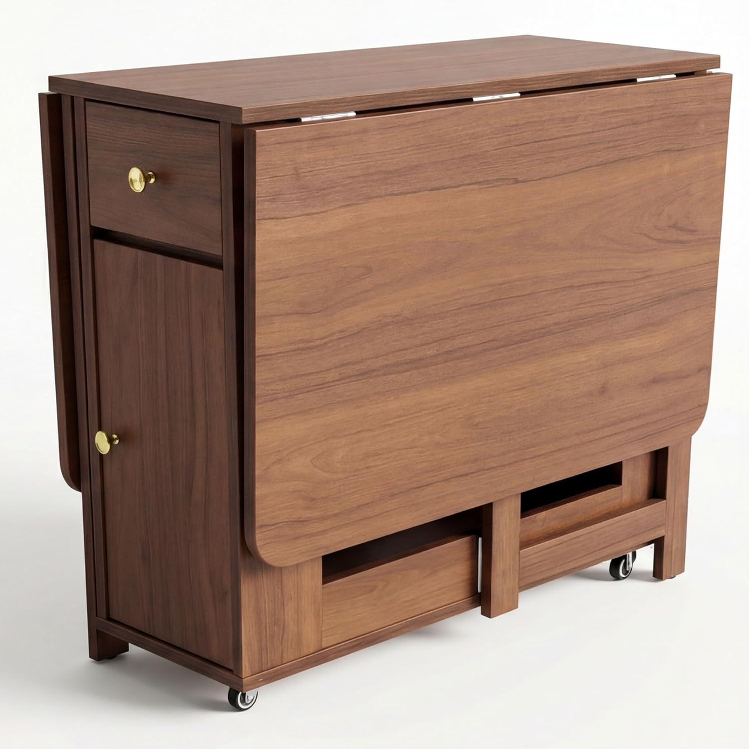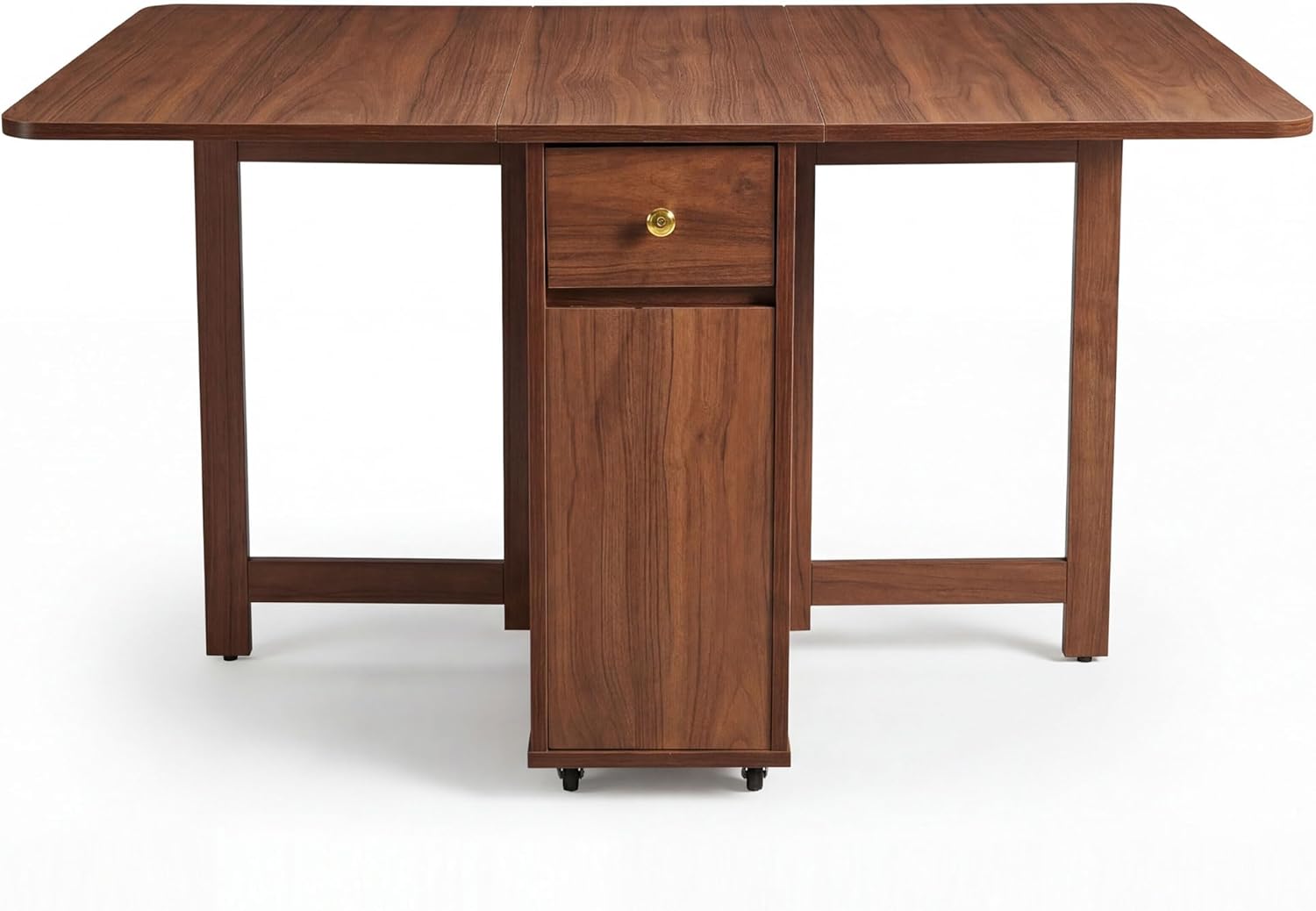 Folding Dining Table and Chairs Set, Fully Assembled Solid Wood Drop Leaf Kitchen Furniture with Storage Cabinet & 4 Lockable Wheels for Small Spaces(Walnut or Black) (Walnut, 59" Table & 6 Chairs)