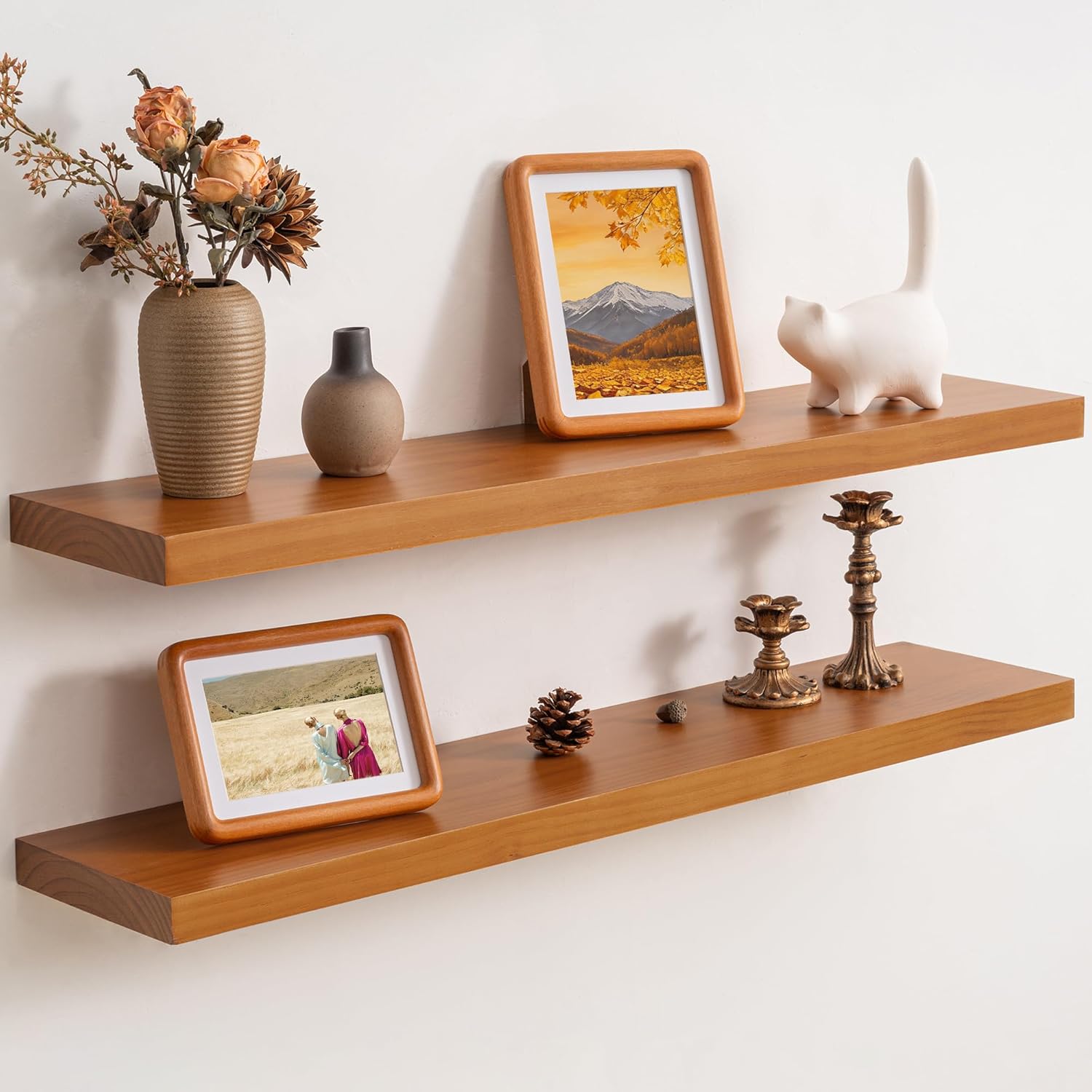 • Natural Live-Edge Design: Featuring organic contours, these floating shelves showcase hand-preserved live edges that add rustic charm. Each piece is unique, offering a one-of-a-kind look that complements both farmhouse and modern interiors