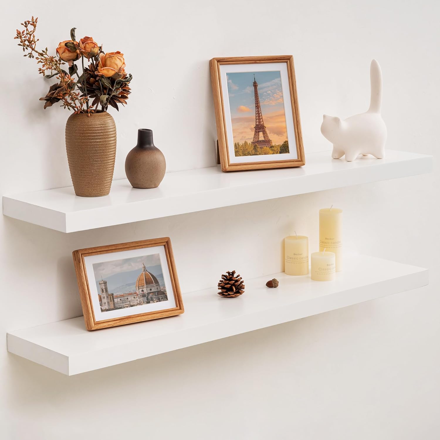 • Perfectly Proportioned 8-Inch Deep Shelves: These 8-inch deep floating shelves offer versatile storage for books (6-8 paperbacks), small plants (up to 6" pots), and decor. Ideal for displaying photos, organizing spices, or storing bedroom essentials, they blend functionality with a clean, streamlined design