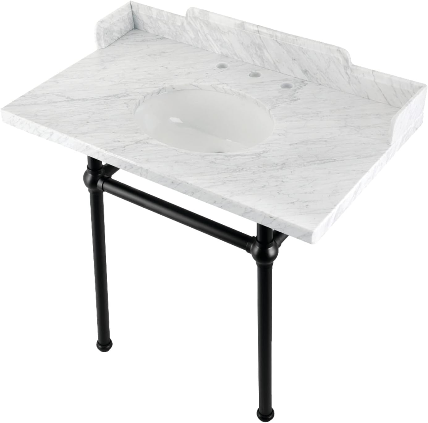 With a beautiful carrara marble counter top, this console sink set is a long lasting, durable, and elegant addition to your bathroom. A fabulous alternative where space is limited or tight making them friendly for the whole family. With different shades and natural designs, otherwise known as veining, no two sinks will be alike. Also for your convenience, anti-slip rubber pads are included with the brass legs to ensure steadiness. Water supply kit, drain assembly, and the faucet are sold separately. Kingston's carrara marble tops are polished, but they are not sealed. Polished marble has a shiny surface and resists stains. Natural stone, even when polished, is still somewhat porous and does remain susceptible to etching by acidic compounds like fruit juice, vinegar, some cleaning solvents, etc. For customers that wish to further protect their investment the marble can be sealed. The following is intended solely for informational purposes. Kingston does not warranty nor accept liability for damages or other negative outcomes resulting from any treatment or coating applied to the countertop after purchase, whether applied by the customer or by a third party. For anyone unfamiliar with this nature of project, Kingston recommends consulting an experienced professional in your area. When looking for a sealant product, please be sure to seek a product specifically designed for use on polished marble, granite or other natural stone surfaces. Be sure to always avoid anything containing a citrus ingredient, acid ingredient, tung oil, linseed oil, or other natural oils. These can damage or discolor your marble.