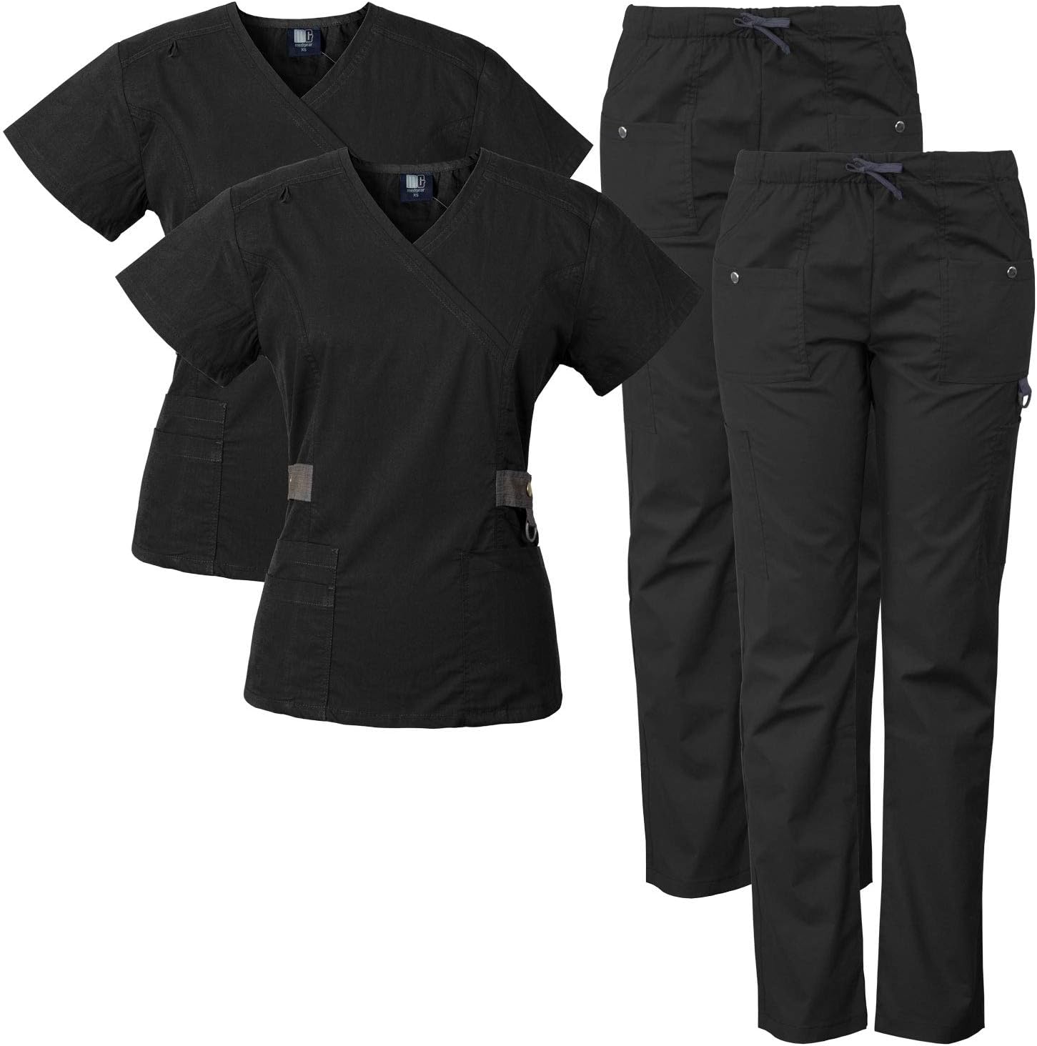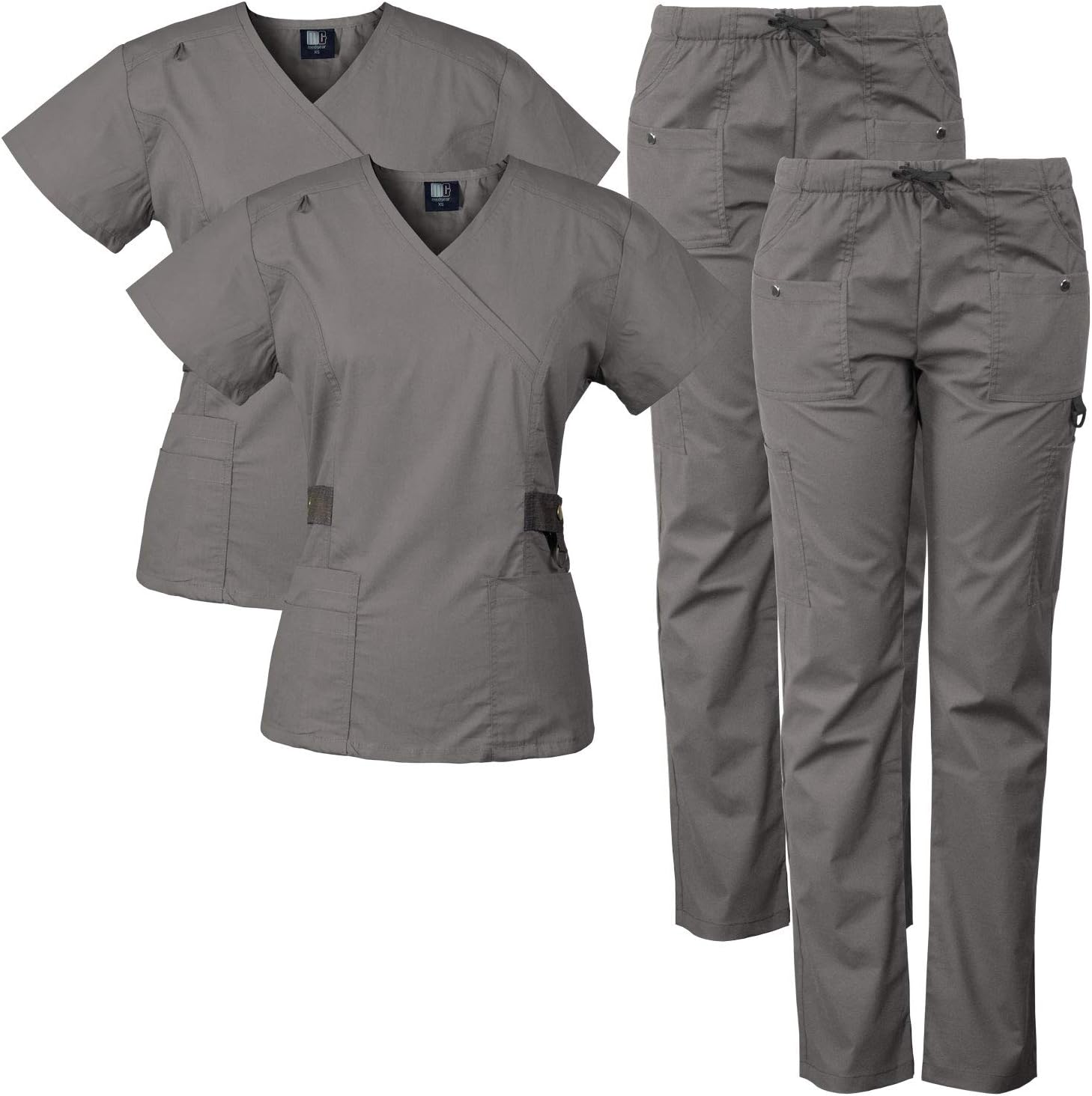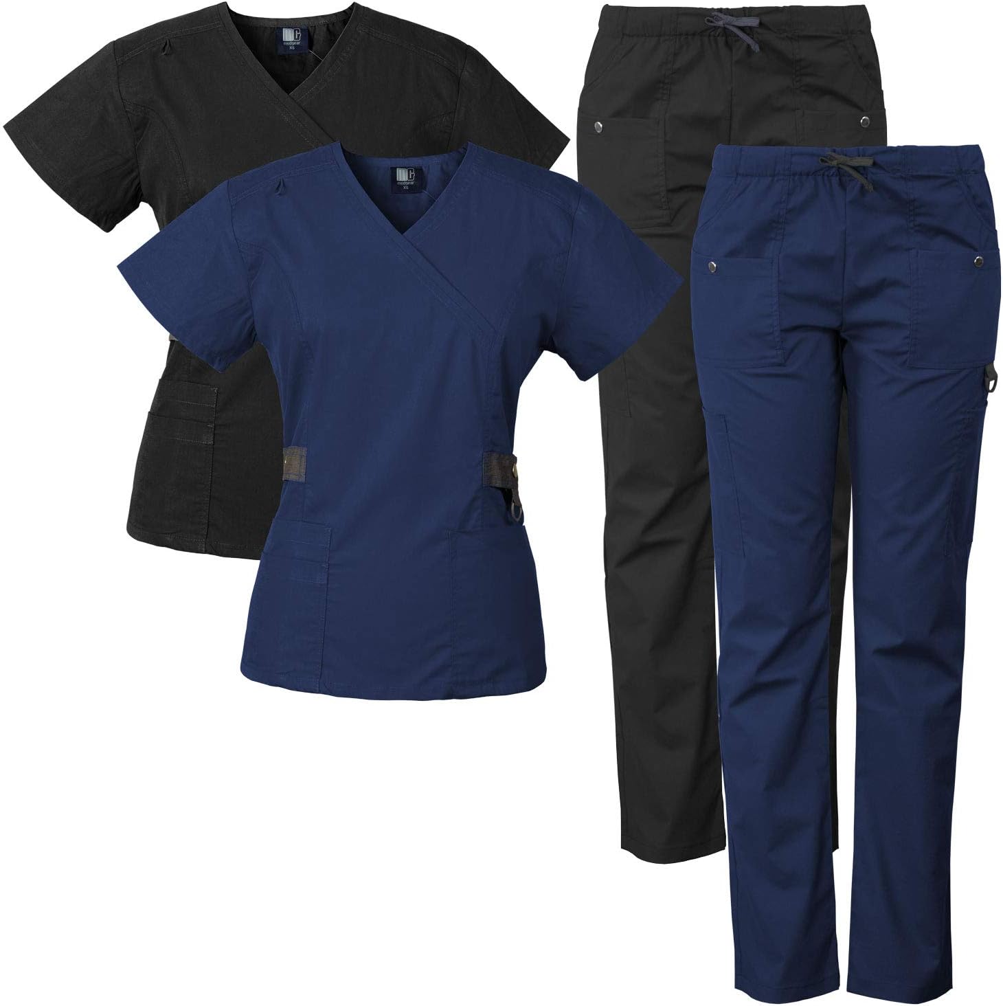Medgear 12-pocket women's medical scrubs set with silver snap buttons. Mock-neck top with contrast detail, 4 lower patch pockets and elastic cord on shoulder. Scrub pants with all elastic waistband and drawstring, 2 pockets with snap button detail and velcro closure, 2 front pockets, 2 cargo pocket, 2 back pockets and D-ring.