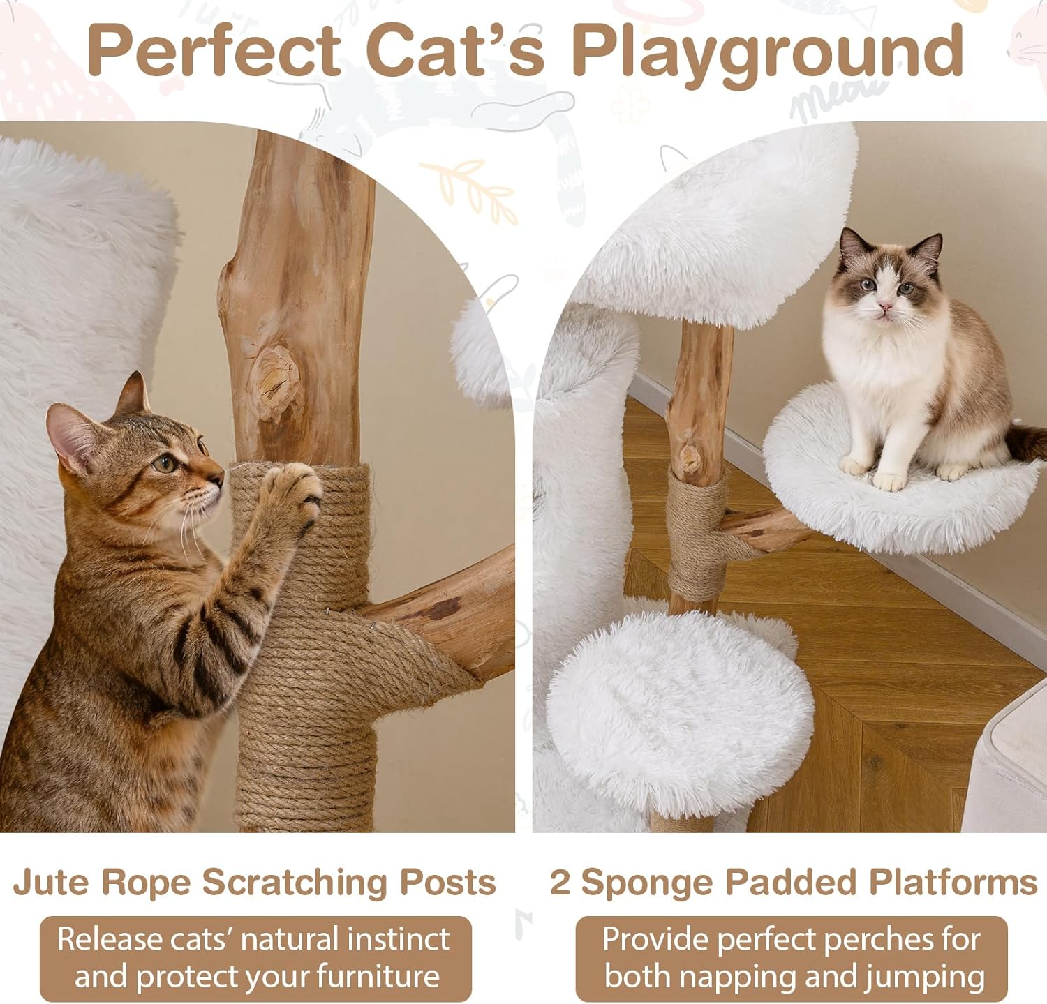 What We'd Like to Share:Bring the beauty of nature indoors with our solid wood cat tree.Unlike others with fragile engineered wood posts, ours cat tower is thoughtfully crafted from genuine pear wood branches for a sturdy and unique design. Each support post boasts an individual shape, giving your feline friend a one-of-a-kind playground. For extra stability, the cat tower features a dual-layer thick board base, keeping your pet safe at every level. The 2-tier condos offer ample space for climbing, exploring, and private relaxation, while the spacious perch delivers a cozy vantage point for observing their surroundings. Moreover, jute-wrapped posts encourage healthy scratching habits and protect your furniture, and the 2 sponge-padded platforms invite both energetic jumps and peaceful naps. Plush, ultra-soft fabric makes lounging a pleasure. Also, the removable, washable perch bed ensures effortless cleaning. Specifications:Color: White+NaturalMaterial: Engineered Board, Pear Wood, Plush, Jute RopeOverall Height: 30.5"/93 cmBase Size: 23" x 19"/59 x 48.5 cm (L x W)Condo Size: 13.5" x 24"/34 x 60 cm (Dia. x H)Size the Top Perch: 23" x 19"/59 x 48.5 cm(L x W)Diameter of Round Platforms: 11.5"/29 cmEach Layer Weight Capacity: 33 lbs/15 kgNet Weight: 38 lbs/17 kgPackage Includes:1 x Solid Wood Cat Tree1 x User’s Manual