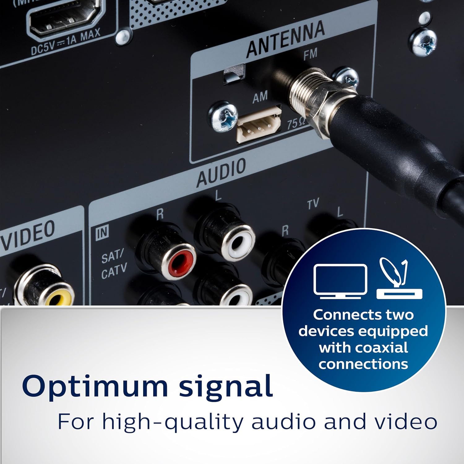 Easily connect your home entertainment system with the Philips RG6 Coaxial Cable. This 15ft. coax cable connects any two video components equipped with 'F' type jacks. It is for use on TVs, HDTV's, cable or antenna boxes, satellite, and DVRs. The quality coaxial cable provides a clear audio and video connection with double shield coax protection from signal loss or interference. It requires no hardwiring or permanent installation. Simply screw the connector on one end of the cable onto the 'F' type jack on the back of your component. Screw the connector on the other end of the cable onto the other 'F' type jack on the second component you wish to connect. This cable is for indoor use only and should not be used outdoors. Do not use for in-wall installations. The Philips RG6 Coaxial Cable is backed by a limited-lifetime warranty.