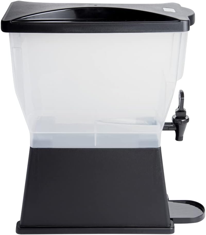 Provide refreshing drinks in style with our Bev Tek 3-gallon Black Beverage Dispenser. With a PP (Polypropylene) construction, this juice dispenser is durable and can handle temperatures from -40F to 160F, making it perfect for serving a wide variety of beverages. The plastic build of this punch dispenser is non-reactive to alcohol, enabling you to serve cocktails as well. Featuring a translucent finish, this plastic juice dispenser provides excellent visibility to highlight the vibrant colors of your beverage. Plus, this 3-gallon beverage dispenser with printed graduations for measurements includes decals for punch, iced tea, decaffeinated iced tea, lemonade, water, and coffee for instant identification. This party drink dispenser comes with a push button faucet/tap for faster flow and fewer drips, letting your guests enjoy beverages without messes. Fitted on a base, this plastic drink dispenser has an 8-inch clearance below the nozzle, providing plenty of room for glasses or even small pitchers. The removable drip tray at the base of this lemonade dispenser catches drips, keeping your countertop clean. For easy refueling and cleaning, the tank of this dishwashable soft drink dispenser is detachable from the base. The tight-fitting lid of this freezable beverage dispenser with a spigot ensures your drinks stay clean during service. Measuring 16 inches long by 8 inches wide by 21 inches tall, this slim rectangle drink dispenser has a capacity of 3 gallons, making it great for parties, catered events, and gatherings. Shipped in a 1 count box.