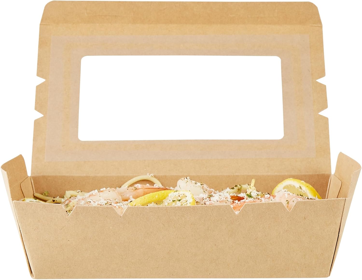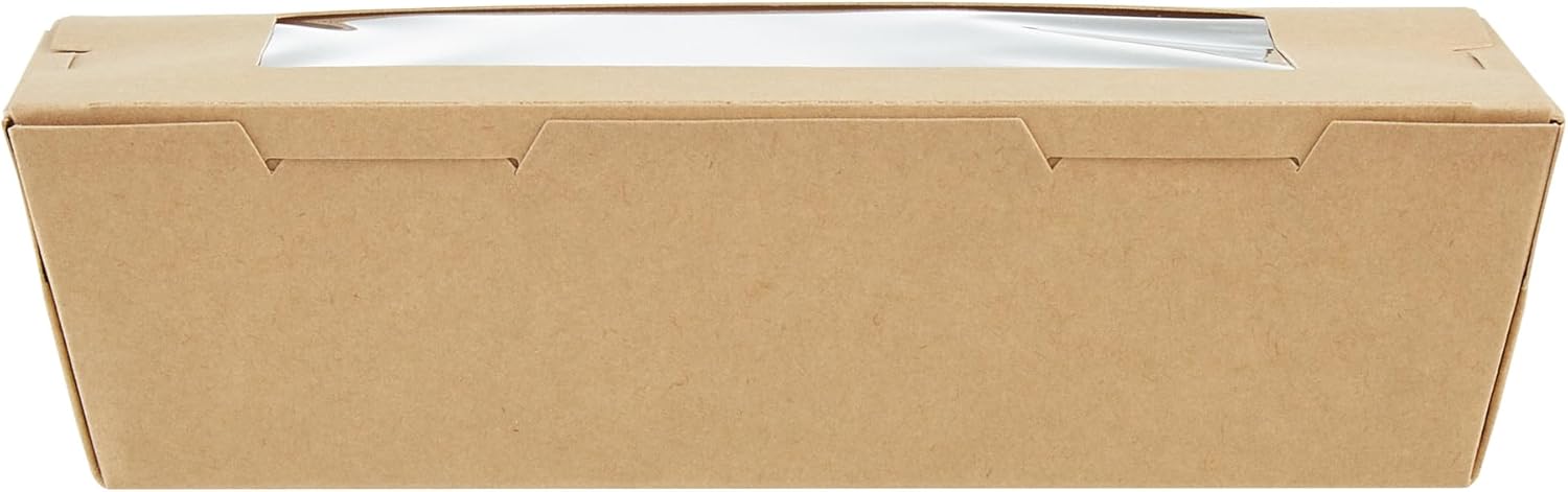 Pack your take out food with our Cafe Vision 42-ounce Kraft Paper Medium Take Out Containers. These to go boxes are equipped with 4 hinge locks that firmly secure the packaging, ensuring your food remains safe during transport. Featuring a clear plastic window, these take out food containers allow your staff to quickly identify contents for efficient organization. The PE lining in these takeaway boxes prevents oil or saucy leaks, providing a neat dining experience for your customers. Crafted from premium paper, these carry out containers are perfect for securely packing both hot and cold food items. The kraft finish of these paper boxes for food adds a stylish touch to your takeout orders, enhancing your brand's presentation. These paper to go containers are freezable, allowing you to store leftovers conveniently for later use. Measuring 7.9 inches in length by 5.5 inches in width by 2 inches in height, these take out boxes have a generous 42 ounces and accommodate a variety of meals. Sold in a 200 count box.