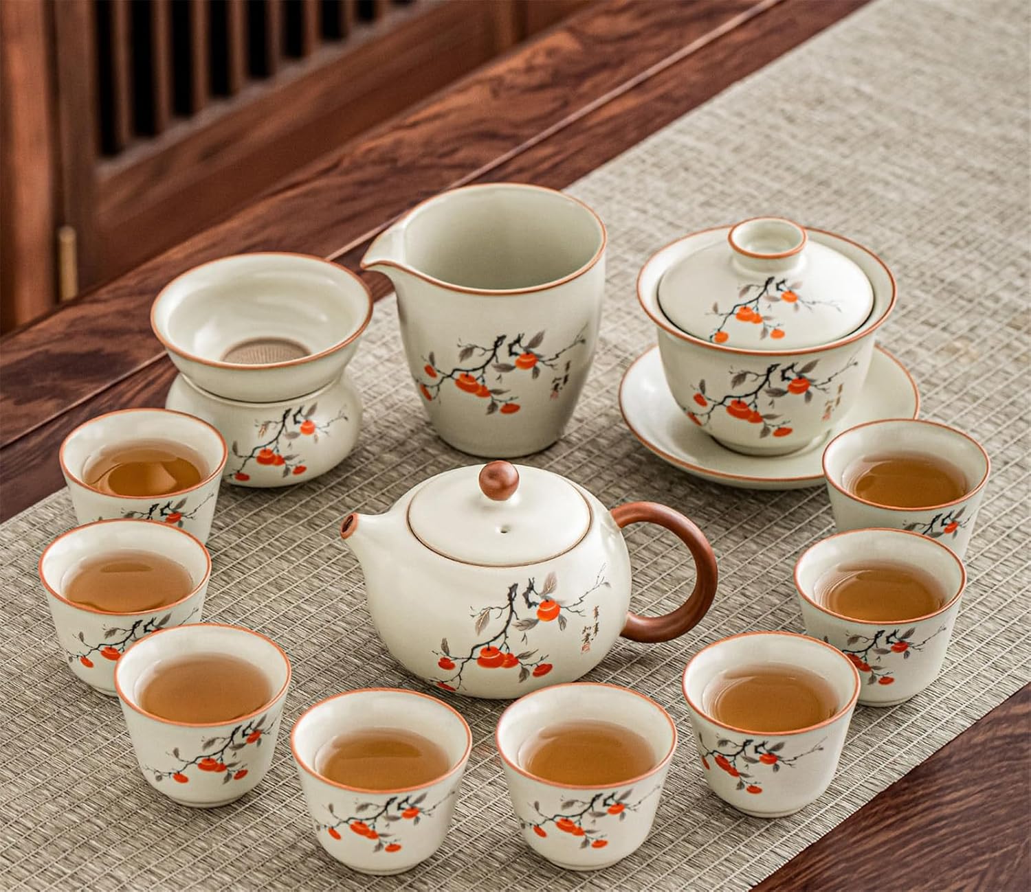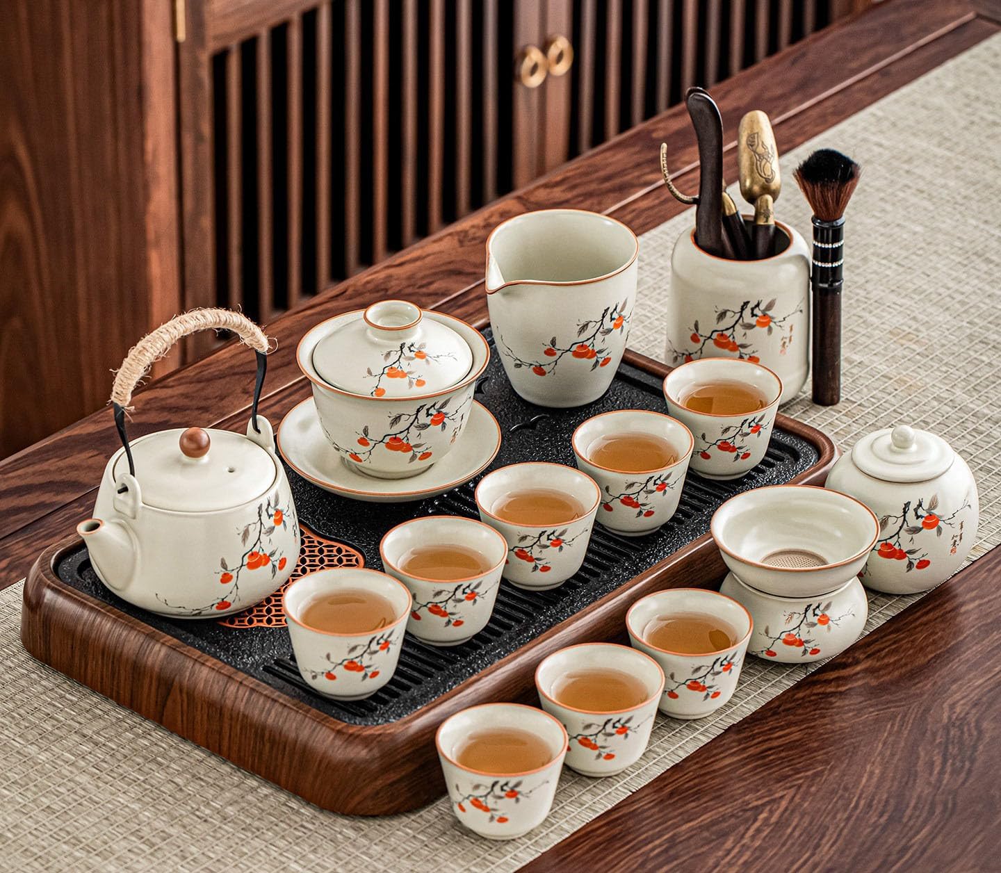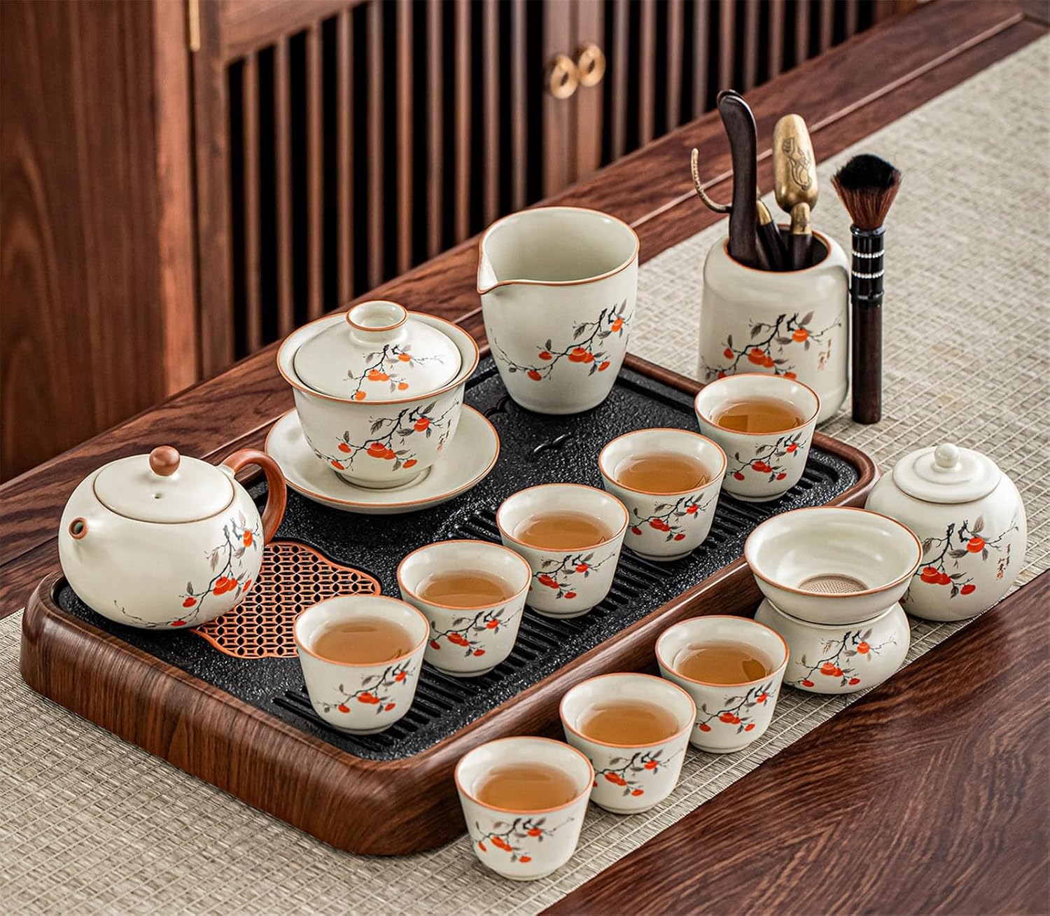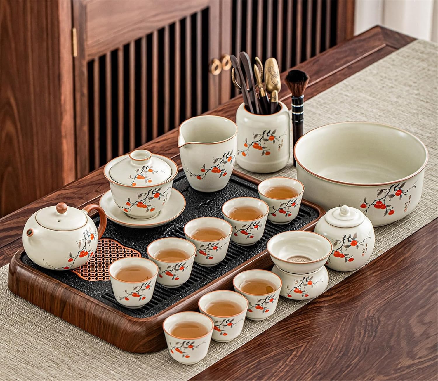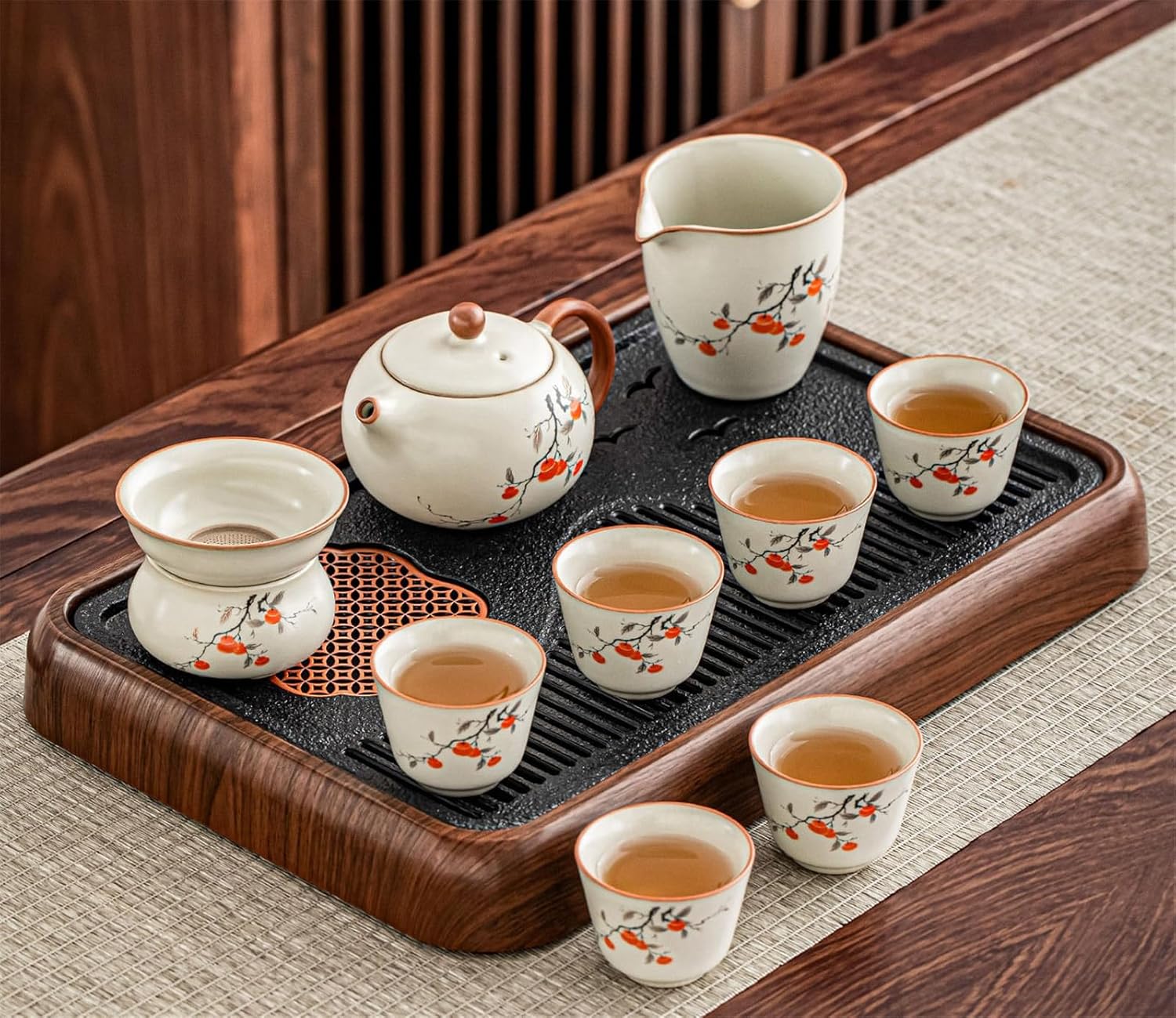 Welcome to this Kung Fu tea set, specially designed for tea enthusiasts. We understand that a perfect cup of tea requires the right vessel. This set blends traditional tea brewing artistry with modern aesthetics and practicality, elevating your experience from visual delight to sensory enjoyment.solo tea set, two person tea set, heat resistant tea cup, crackle glaze ceramic, blue and white porcelain, honeycomb tea set, persimmon tea set, lotus design tea ware, hand painted tea pot, side handle teapot, lift handle teapot, rotating tea maker, stone mill teapot, electric tea tray, compact tea set, minimalist tea set, zen tea ceremony, loose leaf tea accessories, oolong tea set, pu erh tea set, matcha tea set, tea ceremony essentials, tea set with strainer, tea set with tray, dishwasher safe tea cups, microwave safe tea ware, lead free ceramic, decorative tea pot, modern tea set, vintage style tea set, elegant tea gift, housewarming tea gift, new year tea gift, wedding tea gift, business gift tea set, meditation tea set, daily use tea cups, special occasion tea set, beginner tea set, high end tea ware, artisanal tea pot