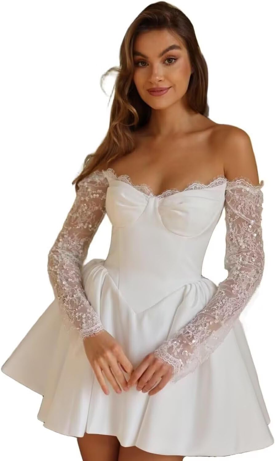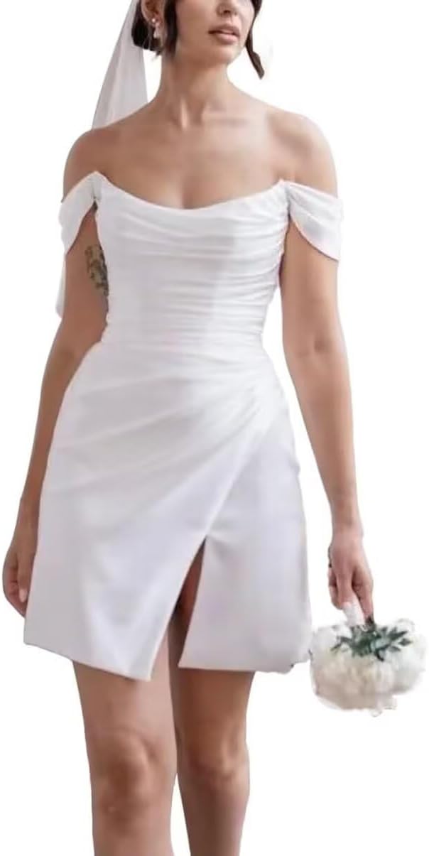 Turn heads and steal hearts in this white short wedding dress designed for the modern bride. Made from premium lace satin, the dress features a beautifully textured floral pattern that elevates the classic mini silhouette. The off-shoulder neckline and voluminous bow detail bring a whimsical yet sophisticated vibe, while the structured skirt flatters your figure and adds a playful flair. Whether you're planning a city hall wedding, celebrating at your bridal shower, or dancing the night away at your reception, this dress was made for moments you'll remember forever. Comfortable yet glamorous, bold yet graceful—this is the dress for brides who want to break tradition in the most stylish way. Pair it with a pearl necklace and low bun for an effortlessly chic bridal look.