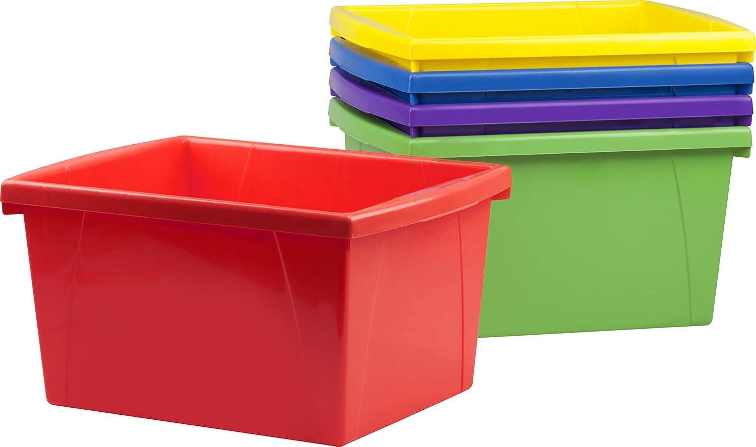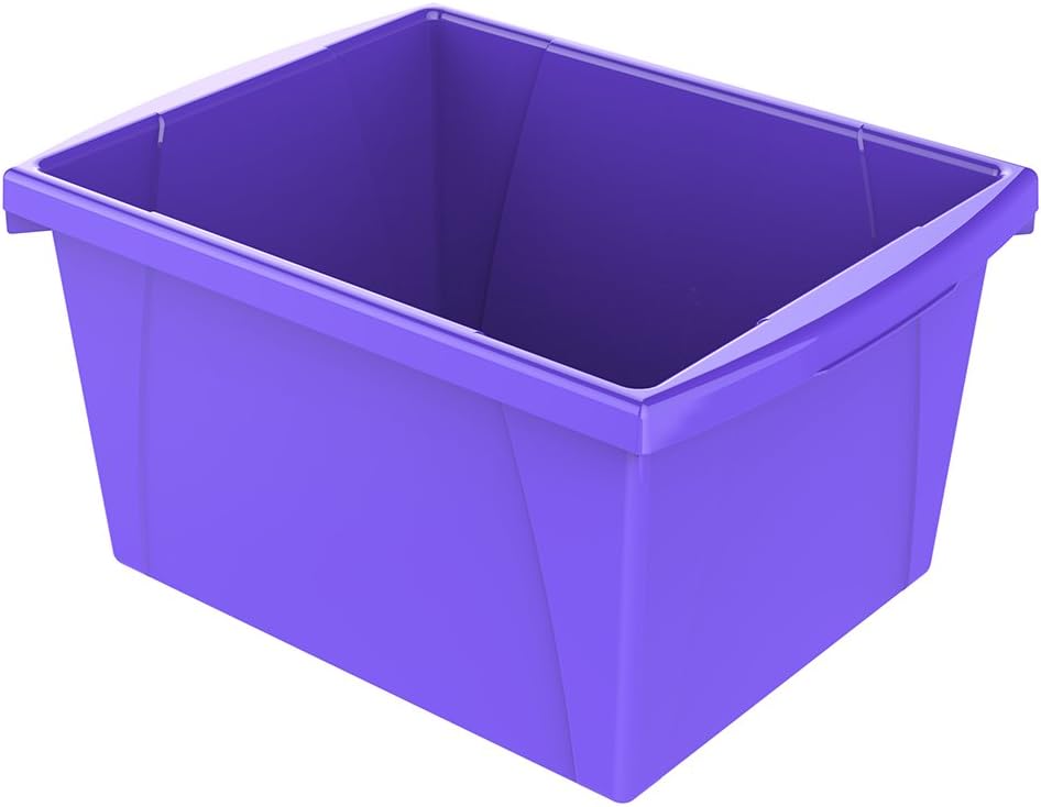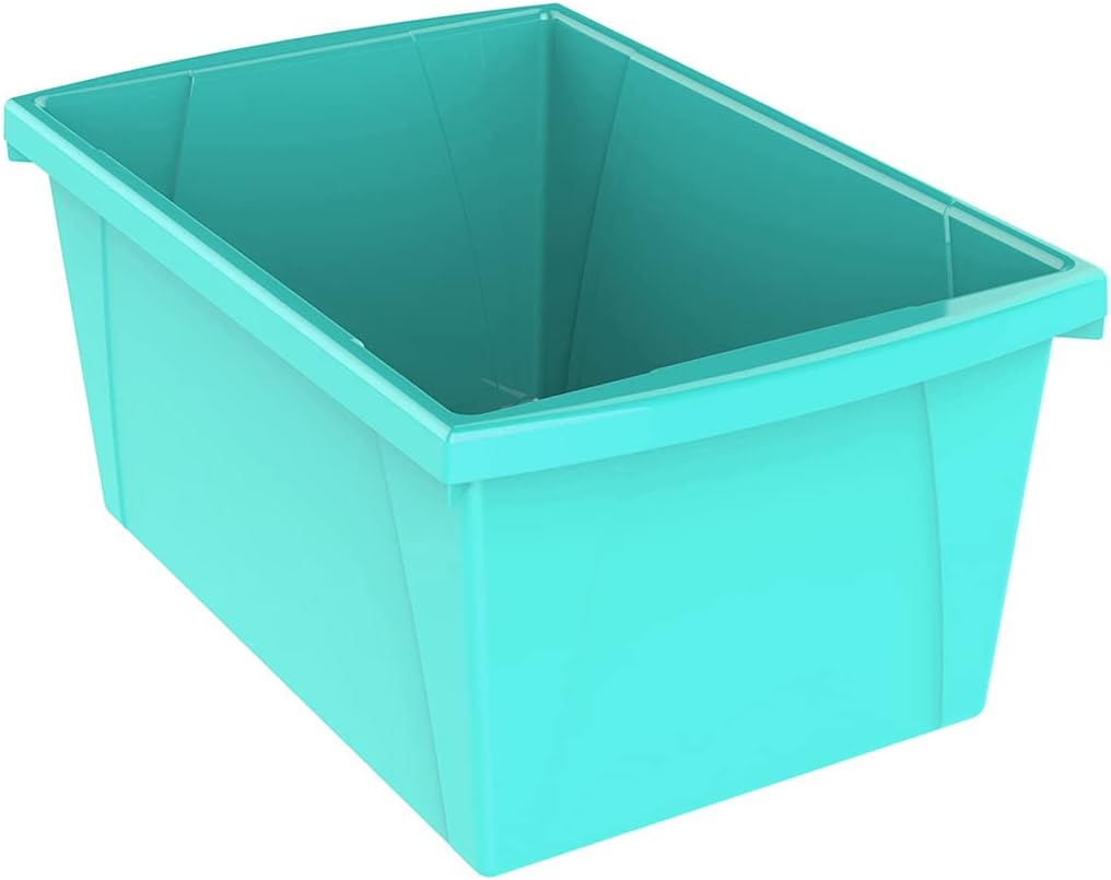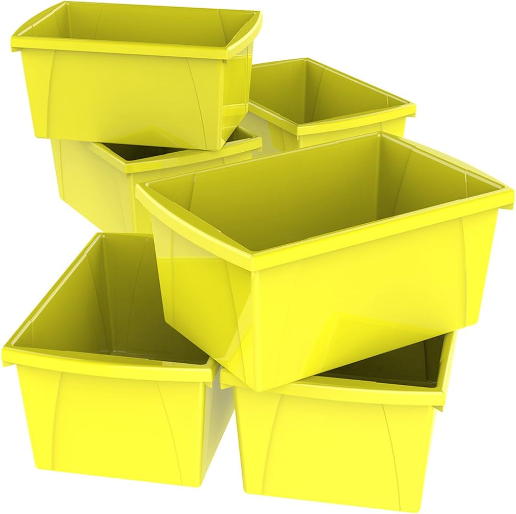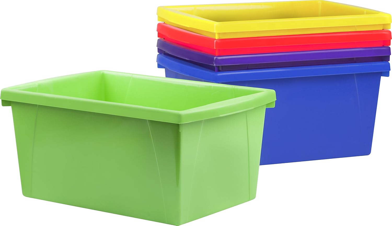 These storage bins are the ultimate companion for your bookshelf or cubby. The easy to grip handles are perfectly sized for big and small hands. They are made of impact resistant plastic and come in wonderfully bright colors. Use them to organize your room and store all your supplies. Measures 13.625"L x 11.25"W x 7.875"H.
