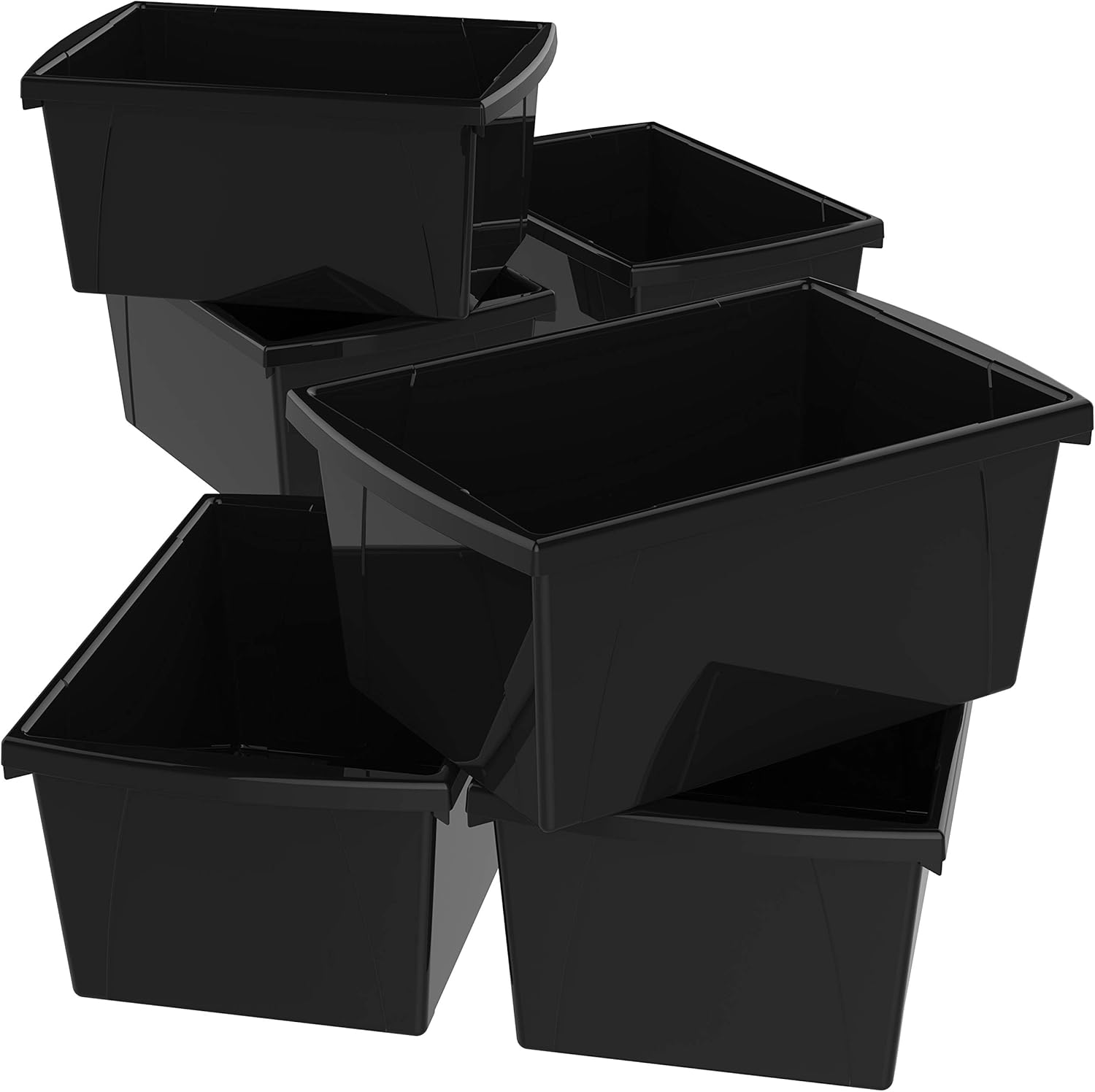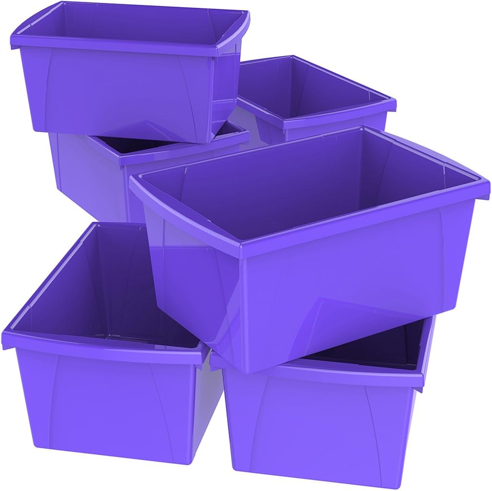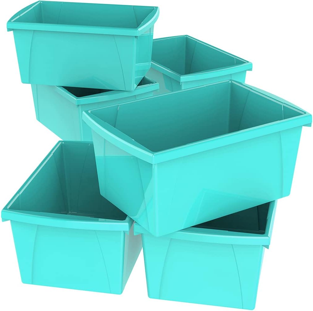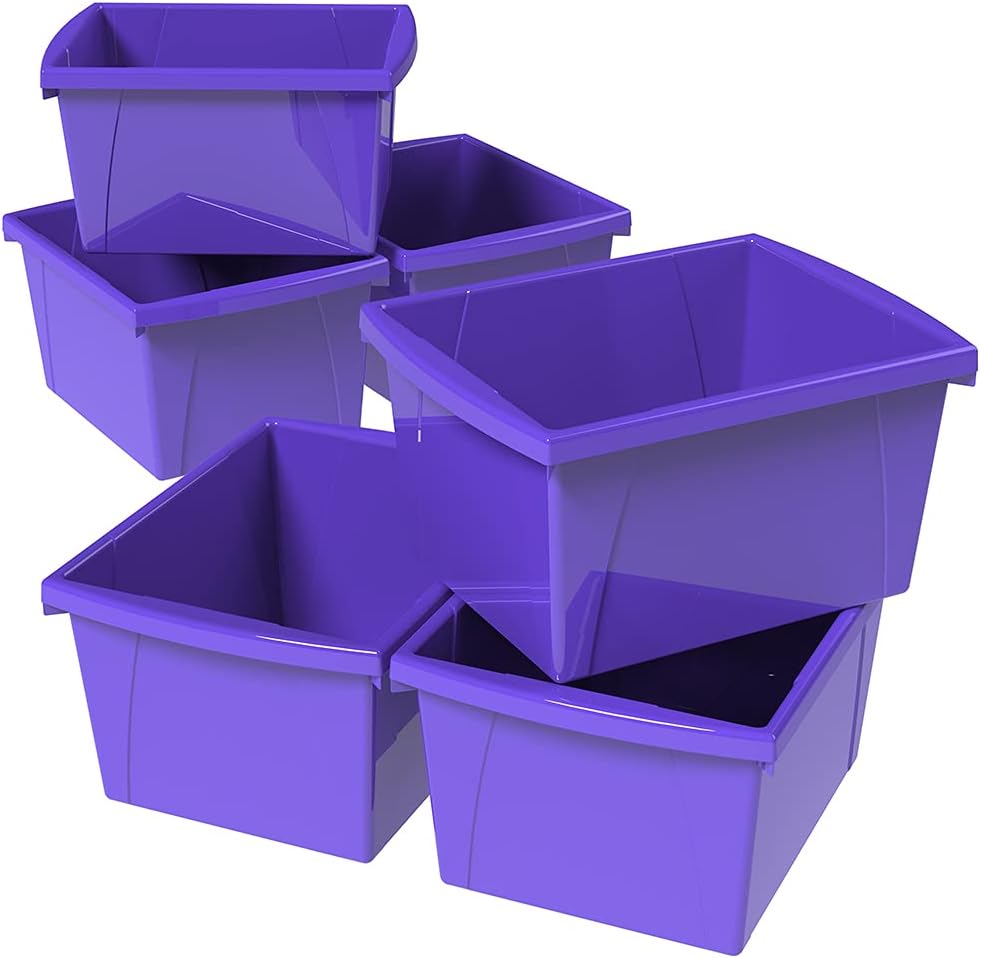 These storage bins are the ultimate companion for your bookshelf or cubby. The easy to grip handles are perfectly sized for big and small hands. They are made of impact resistant plastic and come in wonderfully bright colors. Use them to organize your room and store all your supplies. Measures 13.625"L x 11.25"W x 7.875"H.