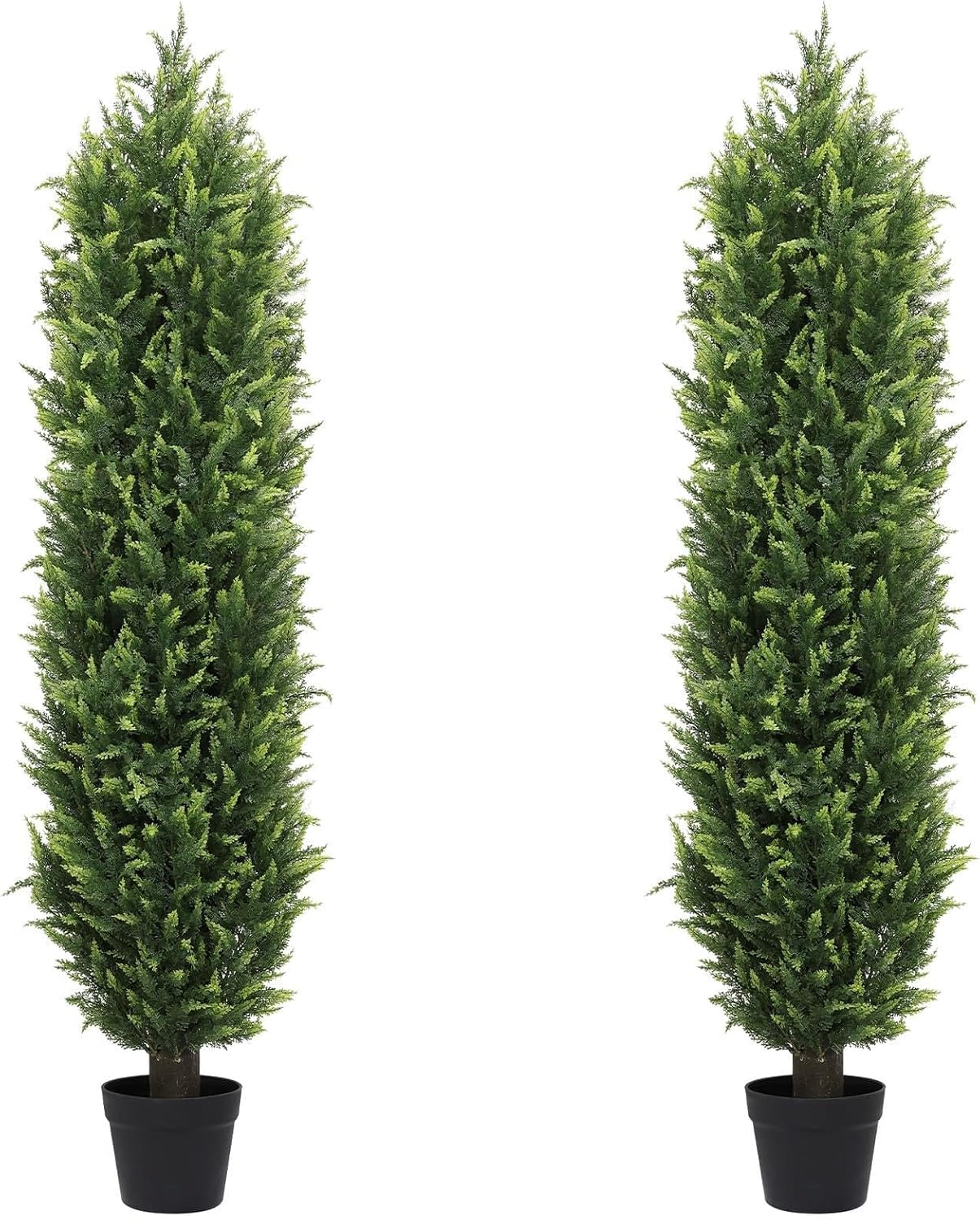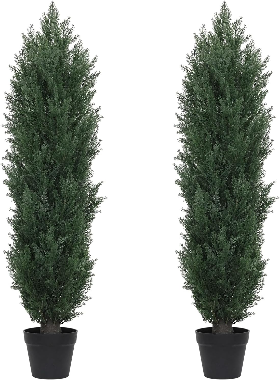 THE BLOOM TIMES 4FT Tall Artificial Cedar Topiary Trees Set of 2, UV Resistant Large Faux Cypress Evergreen Plants for Outdoor Planters, Realistic Fake Bushes & Shrubs for Front Porch Decor