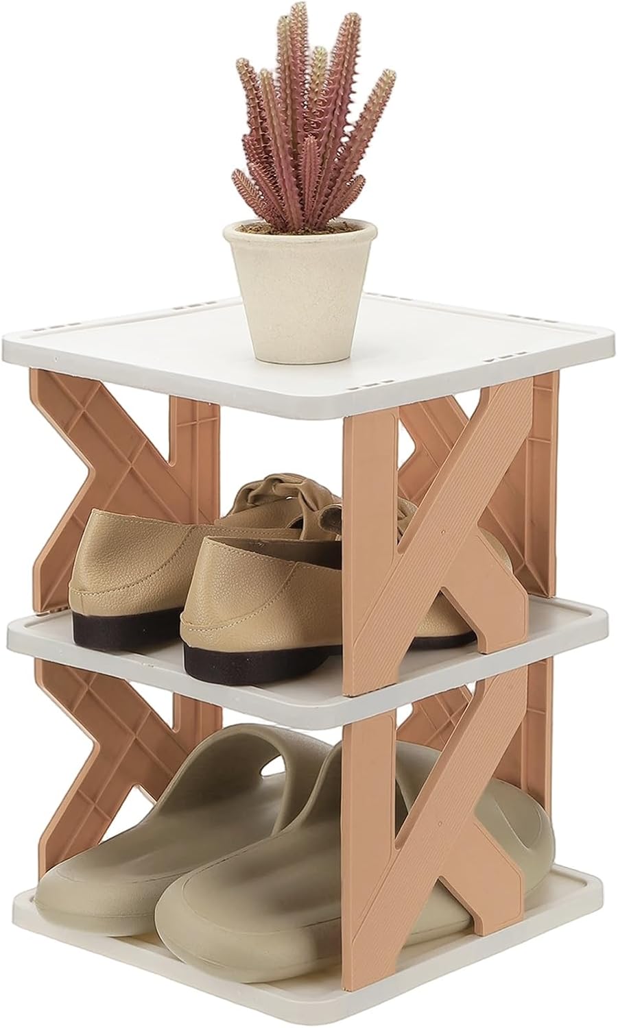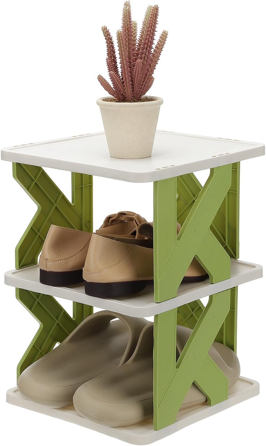 • Durable and Stable: This vertical shoe rack is made of plastic with a sturdy K-shaped structure to ensure that shoes are stored securely and prevent shaking. The raised edge design prevents shoes from falling off the shoe rack.