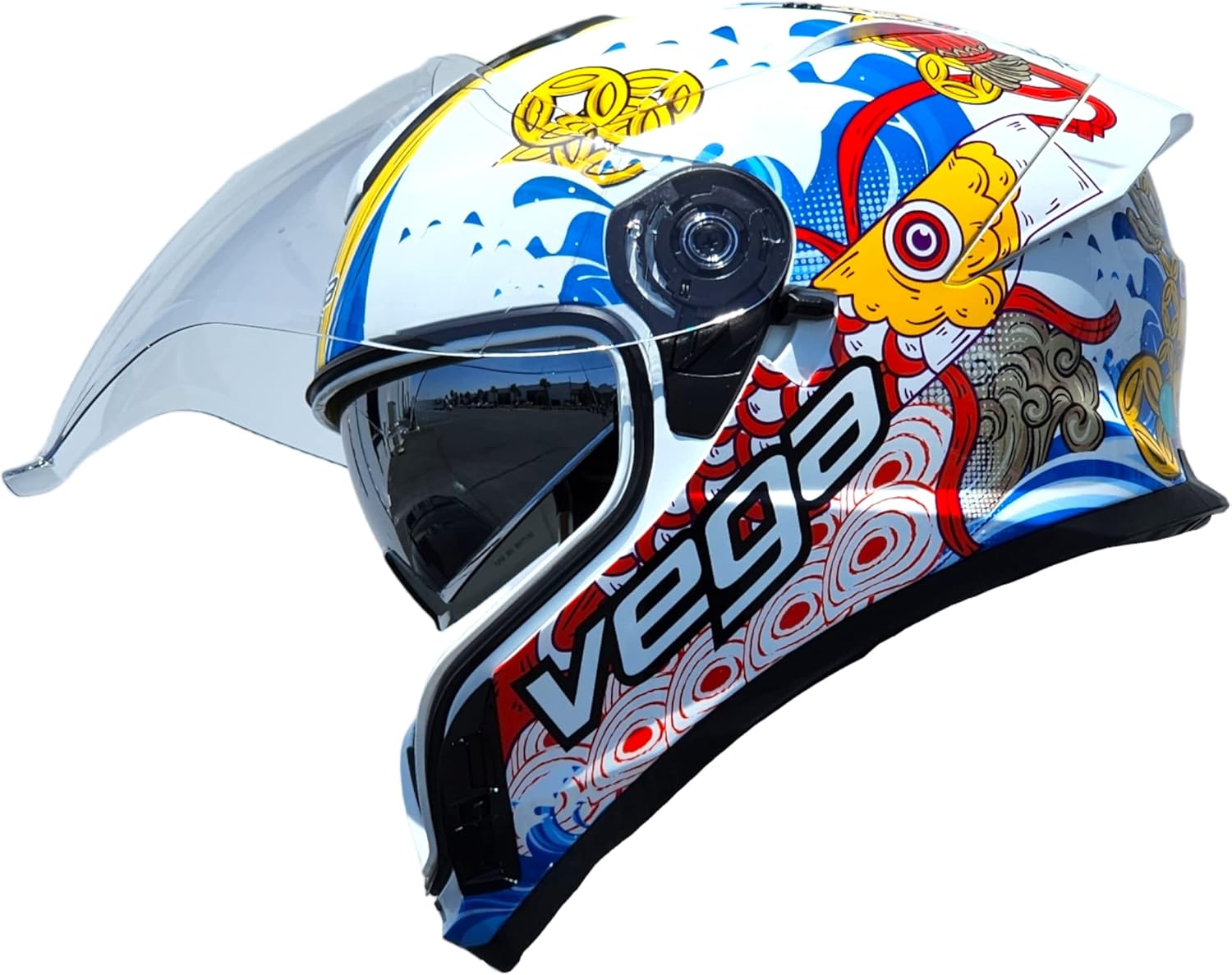 Vega Air GPX Helmet made from high quality materials, Special design in the front for easy drink without remove helmet, Super Strong Special Engineered ABS shell, Meets or exceeds U.S DOT FMVSS. 218 Standard, 7Supervent system provides superior air flow from every direction, High impact absorption black EPS protection Liner, Extra Large Clear shield gives you an enjoyable field of view.