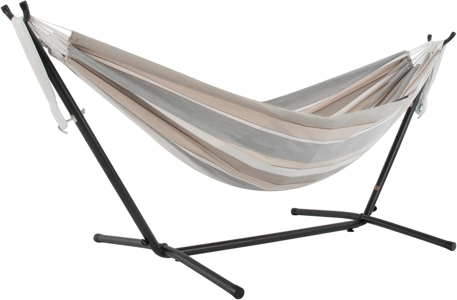 Vivere Double Hammock with Space Saving Steel Stand, Natural (450 lb Capacity - Premium Carry Bag Included)