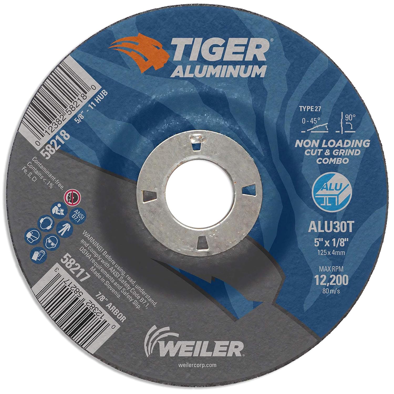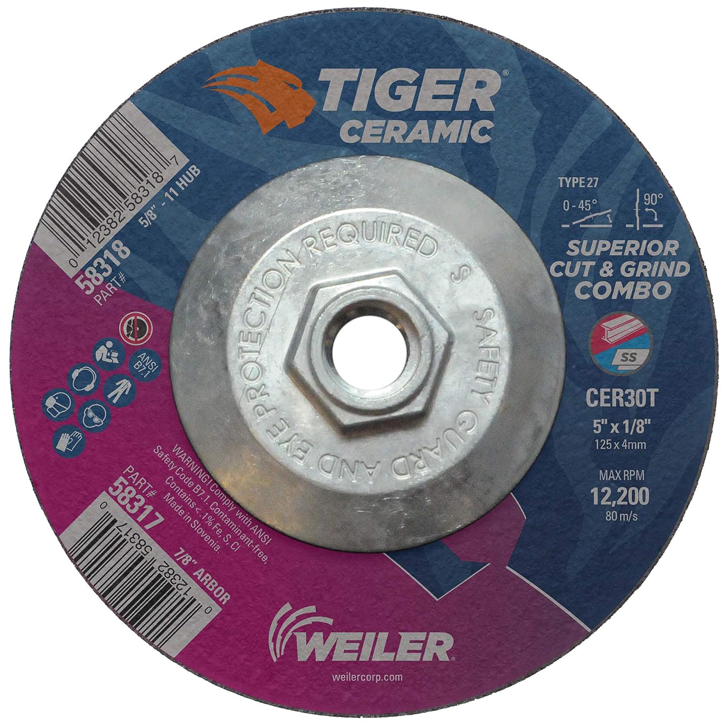 Weiler Wolverine 5 inch type 27 combo wheels deliver a fast cut rate and consistent performance at a good value when cutting and grinding steel and other metals. Combination wheels offer flexibility and efficiency when switching between cutting and grinding applications with a right angle grinder. 5/8" - 11 nutted metal hub allows for quick spin-on, spin-off changeover and eliminates cross-threading or sticking to spindle due to heat build-up. The 7/8" open arbor offers a cost-effective mounting option when using adapting nuts. Wolverine is an aggressive, get it done product line for everyday general purpose use. Weiler’s Combination Wheels offer flexibility and efficiency when switching between cutting and grinding applications. Our Tiger reinforcement technology provides the strength to hold up when grinding, while maintaining a fast cut. Weiler’s value line is manufactured using similar product construction and the same exacting standards as other Weiler power brushes, but engineered to provide cost-effective use in less demanding environments. Wolverine™ brushes (Formerly Vortec Pro®) are an economical choice for the construction trades, low volume production shops and light duty industrial MRO use. Made in the USA.