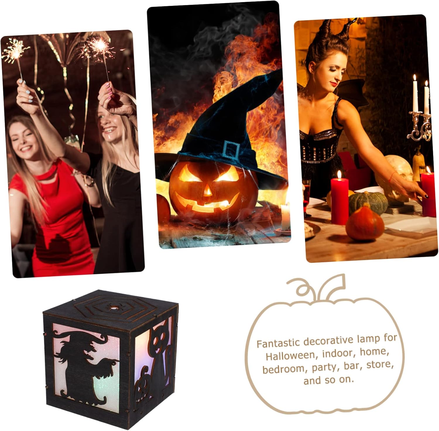 Package Include 1 x Halloween Light Decoration(batteries not included) Features - Material: Wood, plastic halloween light. - Color: As shown halloween ornament. - Size: 9.00X9.00X9.00cm/3.54X3.54X3.54inch decorative light for halloween. - Power supply: 3 x AAA batteries(not included) desktop light decor - Light color: Warm light halloween decorations. - With Halloween elements, it can create a more festive atmosphere for your party and daily life desktop LED light. - Softer lights color, will not irritate your eyes, bringing your room warmer feeling halloween light ornament. - This Halloween LED light decoration is made of wood and plastic material, safe and durable to long time using party light decoration. - Hollow out design, exquisite and pretty, also can be an impressive family or friends halloween LED lights. - The cube shape, flat bottom, is easy for you to place, convenient to use, you can decorate places you want wooden pumpkin light.Goods Descriptiondecorative lights With cube shape design and Halloween elements, it can be a nice choice bring your place festive feeling.ornament Light weight, easy to place and store, can be good Halloween festival decoration, also nice choice for family or friends.halloween LED light This is a Halloween theme light, which uses wood and plastic material that can be used for long term
