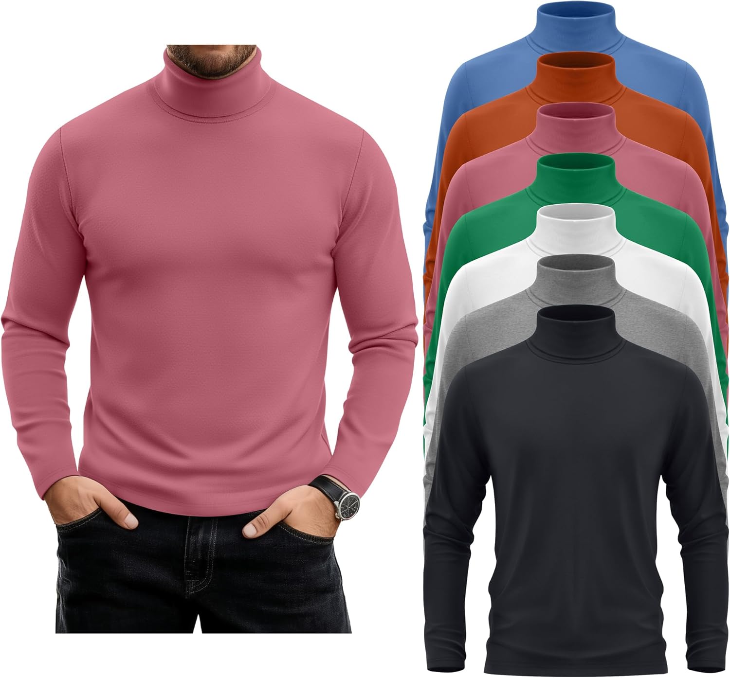 Features: Wearing occasion: From office meetings to social gatherings or relaxed weekends, this men's long sleeve turtleneck is a versatile wardrobe staple. Garment care: These men's turtleneck sweaters can be machine or hand washed in cold water. Hang to dry. Do not bleach. Specifications: Material: 60% Polyester, 35% Cotton, 5% Spandex Package includes: 7 x Men's Turtleneck Tops Notes: Manual measurement, please allow slight errors on size. The color may exist a slight difference due to different screen displays. Please do not wash our products with other clothes, and bleaching is not allowed