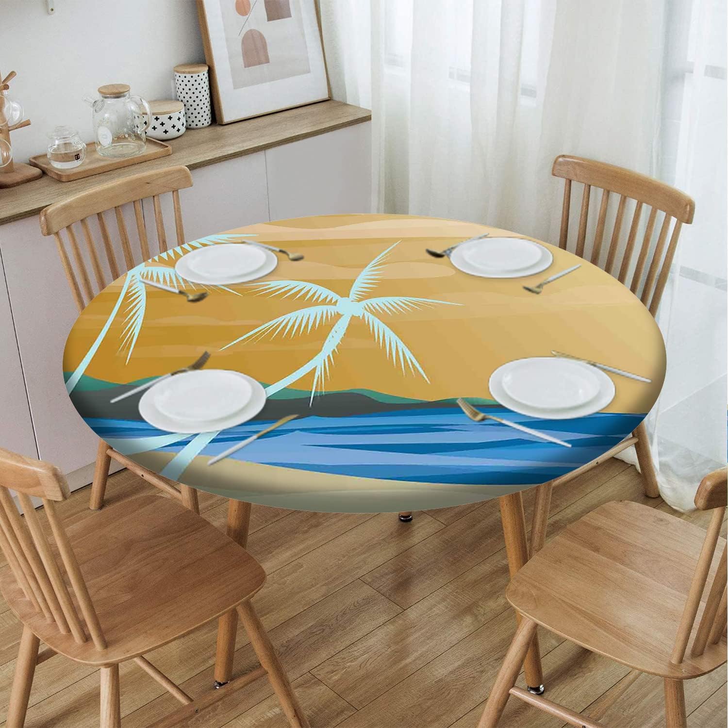 Beach Pattern Round Fitted Tablecloth,Elastic Edge,Suitable for Catering and Kitchen Can Wipe Dining Round Table coverr,Orange Violet,for 57" to 68" Round Tables