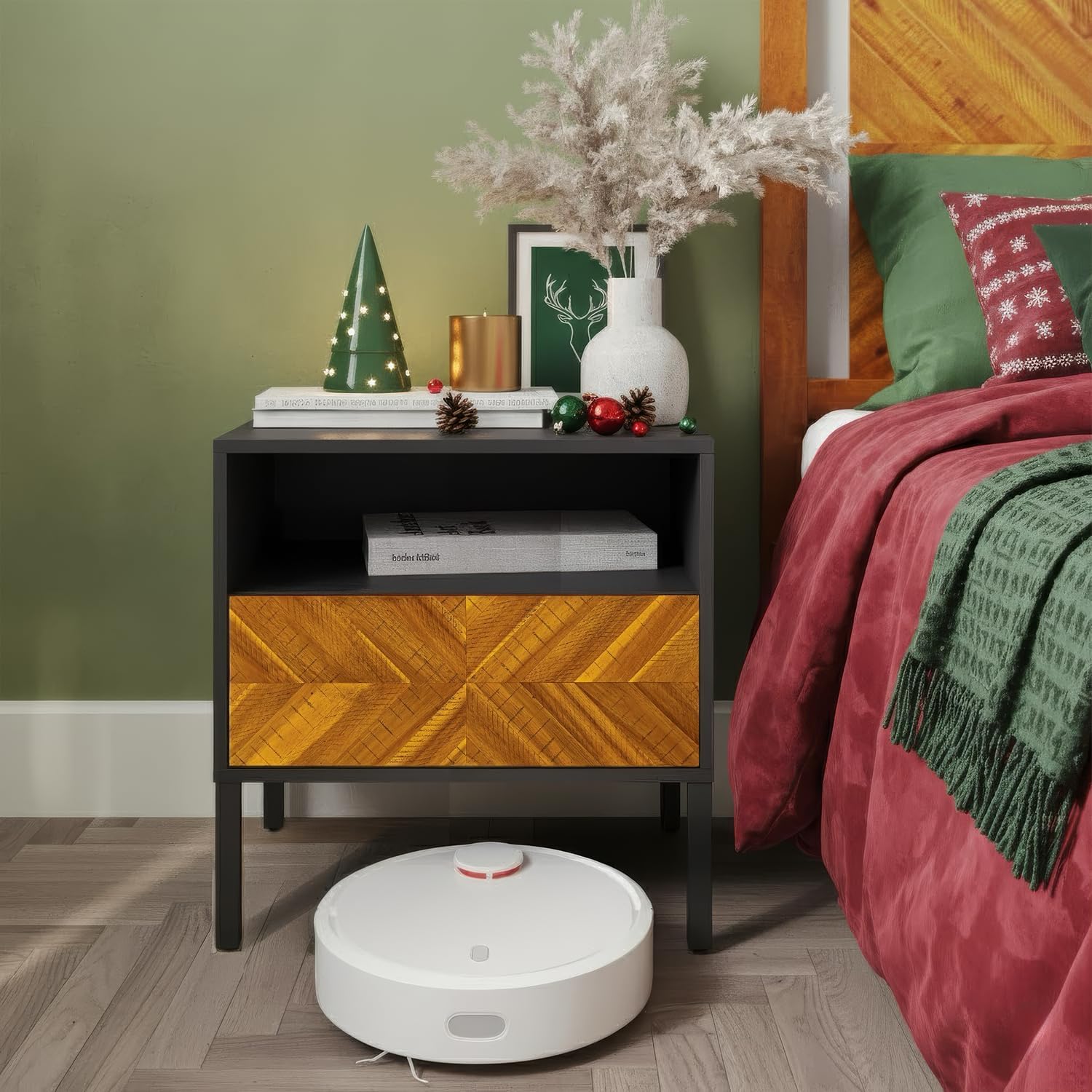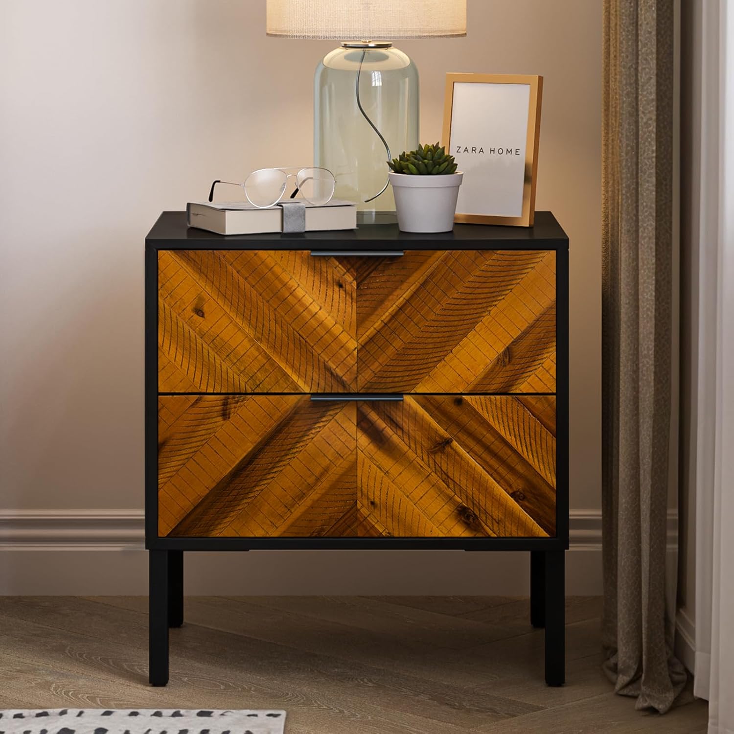 This natural wood nightstand is as a rustic breeze blowing into your room, brings you sweet dreams with faint scent of wood. Vivian Solid Wood Nightstand can completely immerse you in the experience of walking up, reaching into the drawer to take a headphone, listening to your favorite song while sipping a hot cup of coffee. Our drawer side table wears a rustic charm but is equally sturdy and durable thanks to its high-quality materials. With one drawer and cabinet space for storing and organizing your clutter, this handmade bedside table is the ideal addition to any bedroom. The design is inspired by herringbone and features a brownish-pale color combined with black, making it suitable for many different living spaces. The legs of the wide end table are equipped with plastic levelers which can be situated anywhere fulfilling all your needs by adjusting the legs up or down. Hardware is included for hassle-free assembly. Follow the instruction and you can put it together in a few steps. Acacia Wood Nightstand Overall Dimension: 21.7 inches (W) x 15 inches (D) x 22.8 inches (H)