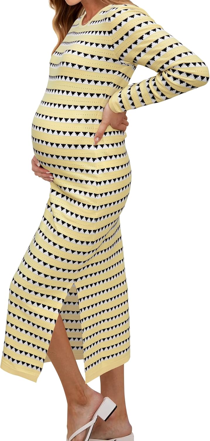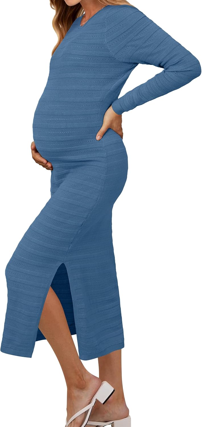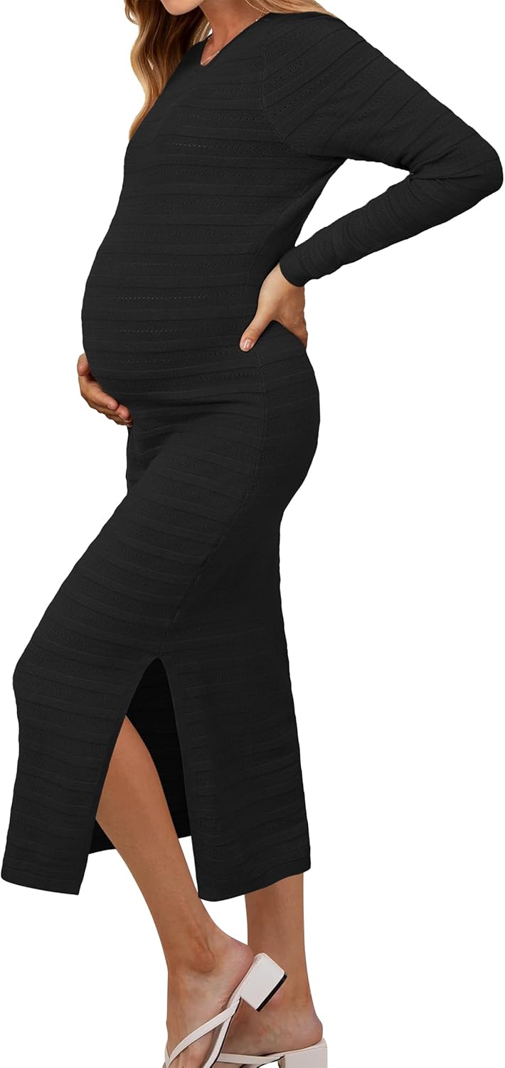 OUGES Womens 2025 Fall Maternity Dress Long Sleeve Crewneck Side Slit Midi Dress Bodycon Knit Sweater Dress