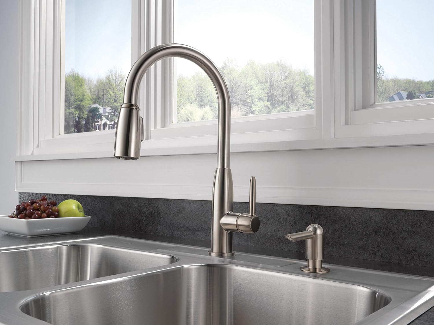 Product Description This integrated handle pull-down kitchen faucet from Peerless comes with a matching soap/lotion dispenser. The high-arc spout provides a large working area and, combined with the pull-down spray wand, helps with washing or cleaning up in the sink. From the Manufacturer This integrated handle pull-down kitchen faucet from Peerless comes with a matching soap/lotion dispenser. The high-arc spout provides a large working area and, combined with the pull-down spray wand, helps with washing or cleaning up in the sink.