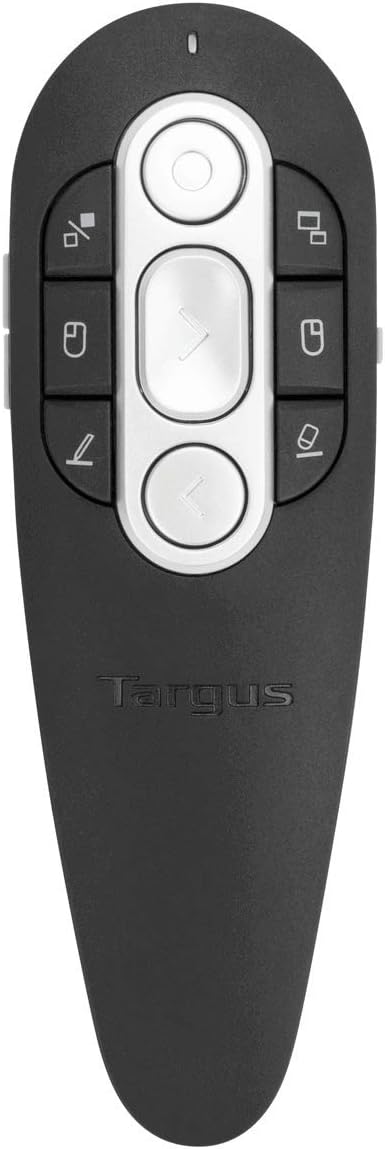 The Targus Wireless Presenter with Laser Pointer makes it easy to control your presentation from up to 50 feet away. The ergonomic design with soft touch surface makes it easy to hold the device in your hand and navigate through the buttons comfortably. The built-in laser pointer allows you to highlight key points while the other keys allow you to page up, page down, exit/resume presentation mode, and darken screen. The preset RF connection enables true plug-and-play capability; no driver is required.