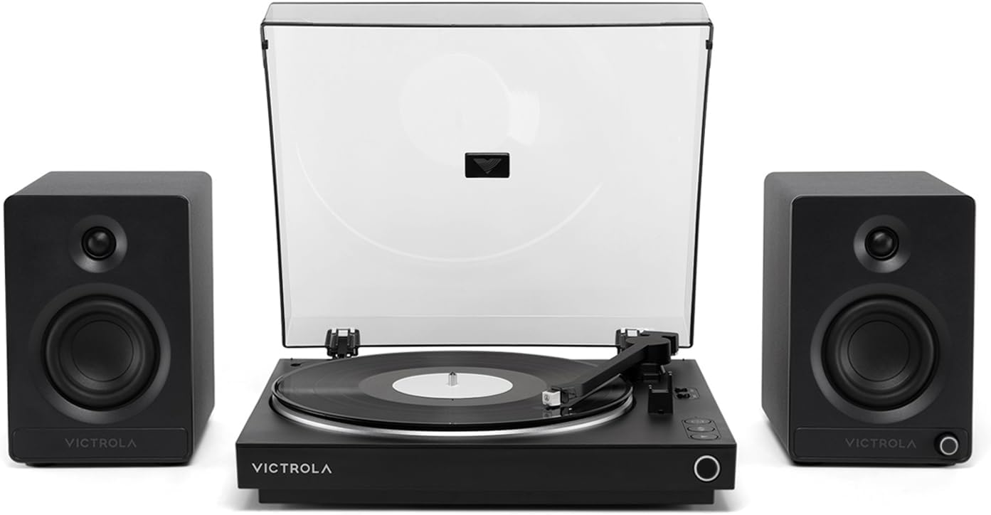Victrola Fully Automatic Turntable with Sleek Design Discover the effortless joy of vinyl with the Victrola Automatic Turntable, a masterpiece of modern audio technology that redefines simplicity with its intuitive controls and one-touch operation. Place your 33 1/3 or 45 rpm vinyl record on the platter, press play, and immerse yourself in the rich, warm sound that vinyl is renowned for. The innovative repeat function allows you to continuously enjoy a side of a record, perfect for setting the mood on any occasion. Equipped with the Audio Technica ATN3600L MM cartridge, the Victrola record player delivers exceptional audio quality. Whether you prefer the convenience of wireless streaming via Bluetooth to your compatible speakers or headphones, or the traditional wired connection using the included RCA cable and switchable phono pre-amp, the Automatic offers versatile connectivity options to suit your setup. Sleek and stylish, this Bluetooth turntable features a modern aesthetic and discreet design that blends easily into your living room, bedroom, or office, while the removable dust cover keeps your turntable and vinyl records protected. Level up your entertainment with the Victrola Automatic Turntable, where innovation meets tradition to deliver a superior vinyl listening experience that is easy to use and aesthetically pleasing.