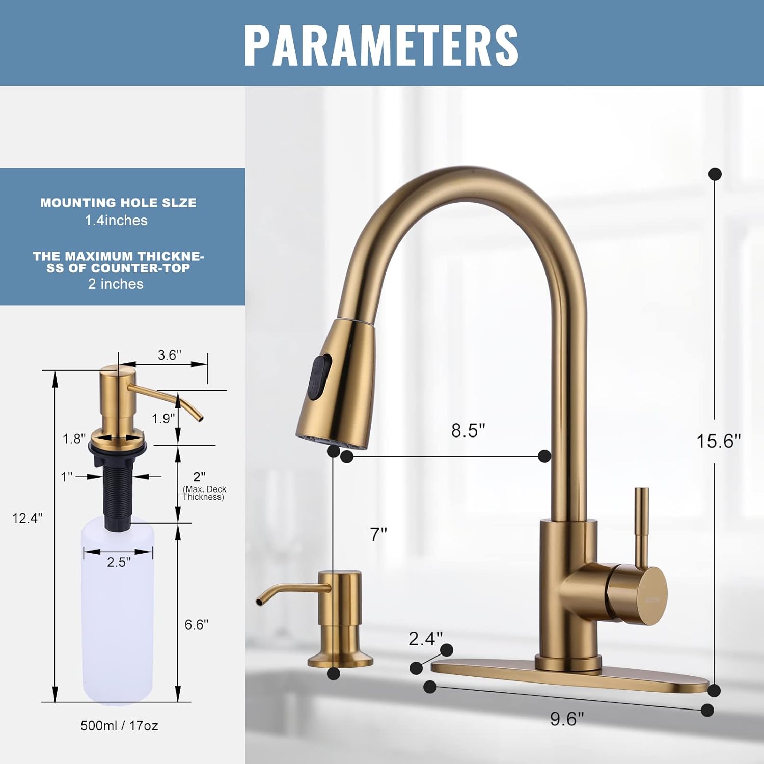 WOWOW Kitchen Faucet Head Replacement Gold, 3 Function Pull Out Spray and Brushed Gold Kitchen Faucet with Soap Dispenser
